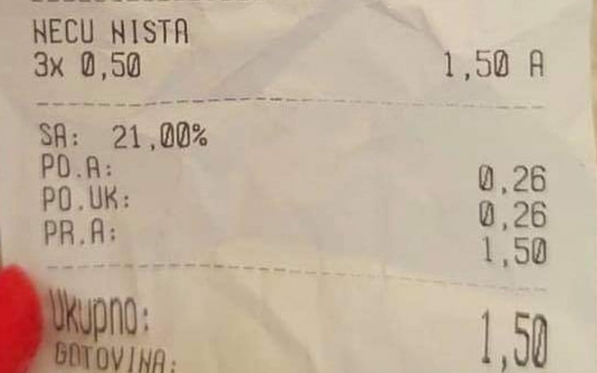 "Neću ništa", navedeno je na računu po cijeni od 0.50 eura. Kako piše na računu, cifra za tri puta "neću ništa" bila je 1.50 eura.