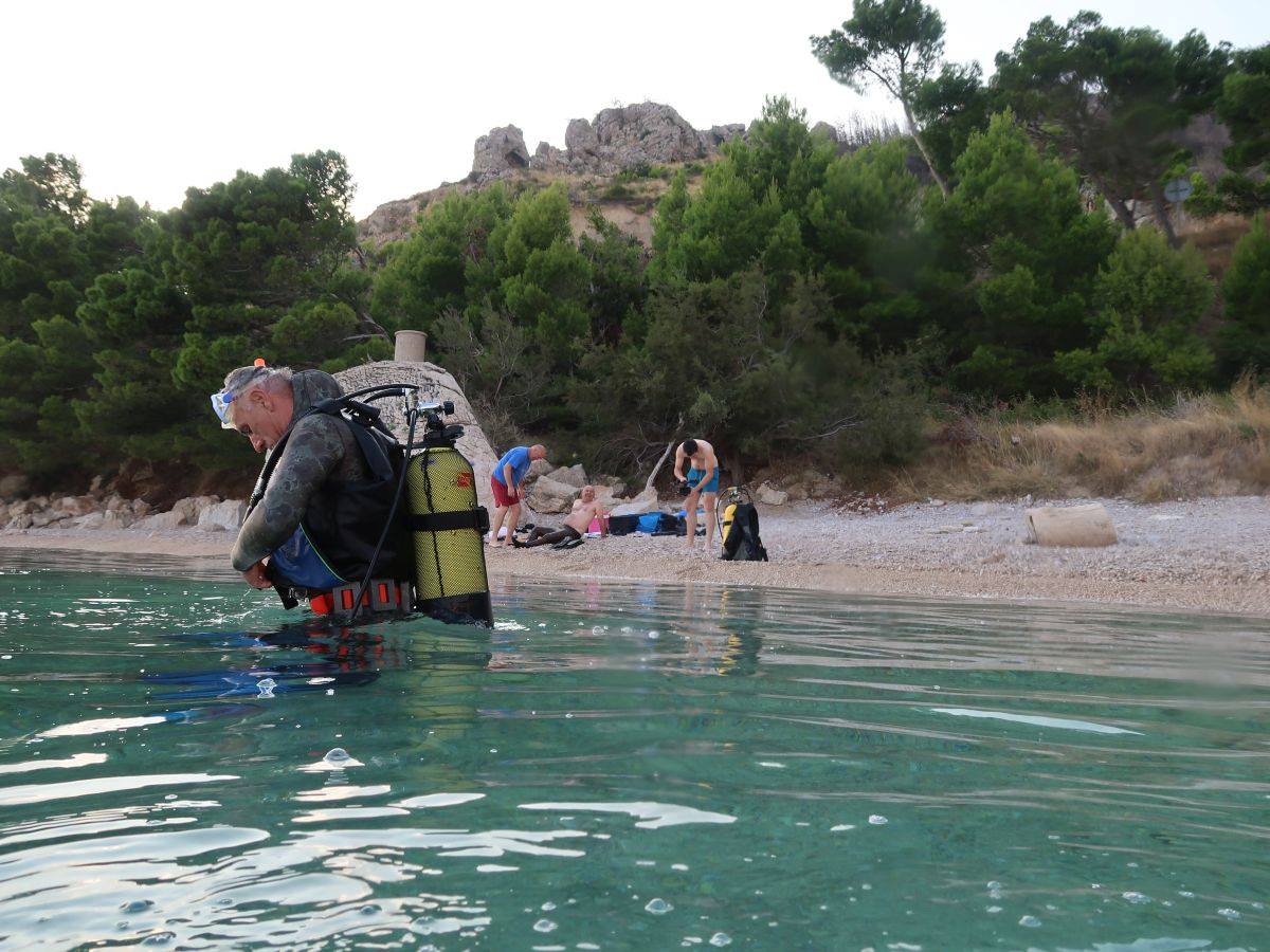 Također, vidljivost je obično vrlo dobra, strujanja također nisu prevelika, a ako ih i ima, obično su prema Omišu. Oko olupine obično pliva i jato crneja, a tu je stanište i raznobojnih puževa. Ukoliko želite, od olupine možete krenuti u pravcu Omiša po pjeskovitom dnu prateći dubinu 10-12 metara i nakon stotinjak metara dolazimo do niza ogromnih stijena s prolazima i rupama oko kojih ima dosta riba i raznih spužvi, a na pješčanom dnu i periski.