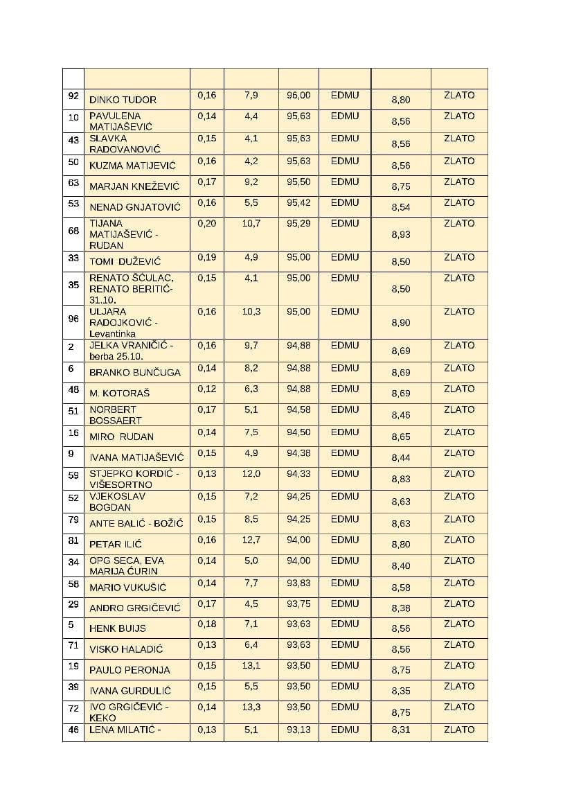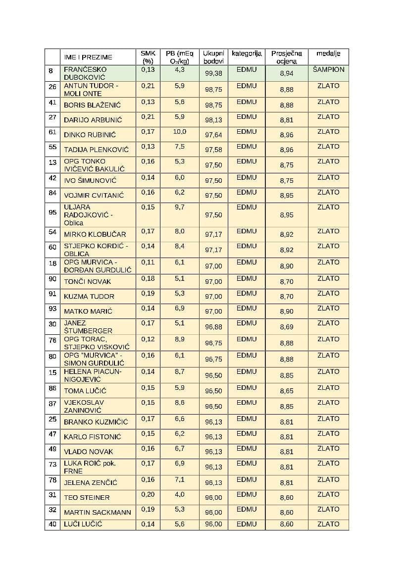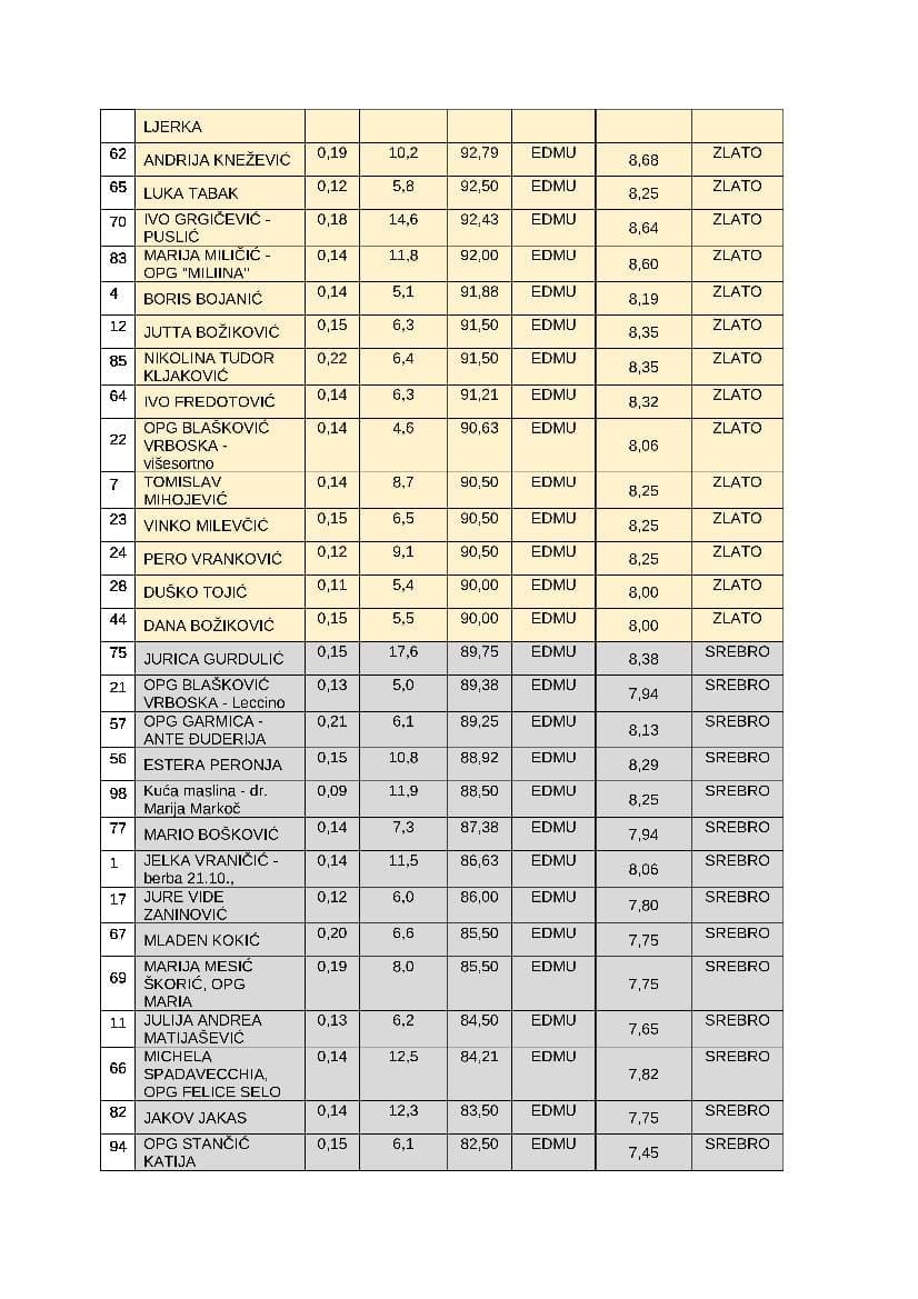 Drugo mjesto u kategoriji ekstra djevičanskog maslinovog ulja osvojio je Ante Tudor - Moli Onte s 98,75 bodova, dok je treće mjesto pripalo Borisu Blaženiću s istim brojem bodova. Ove godine na natjecanje je prijavljeno ukupno 98 uzoraka maslinovog ulja, od kojih je dodijeljeno 73 zlatne, 14 srebrnih i jedna brončana medalja.
