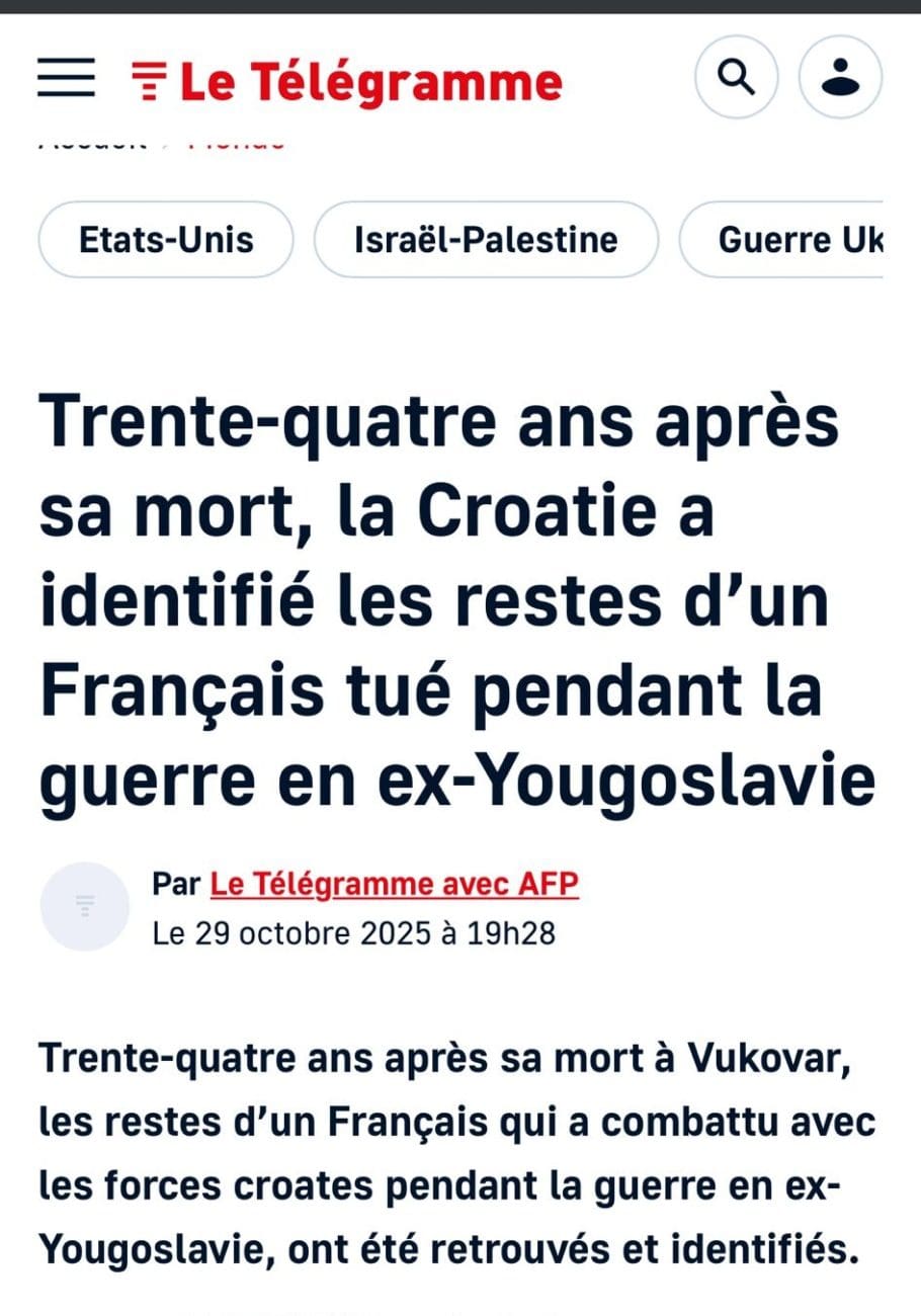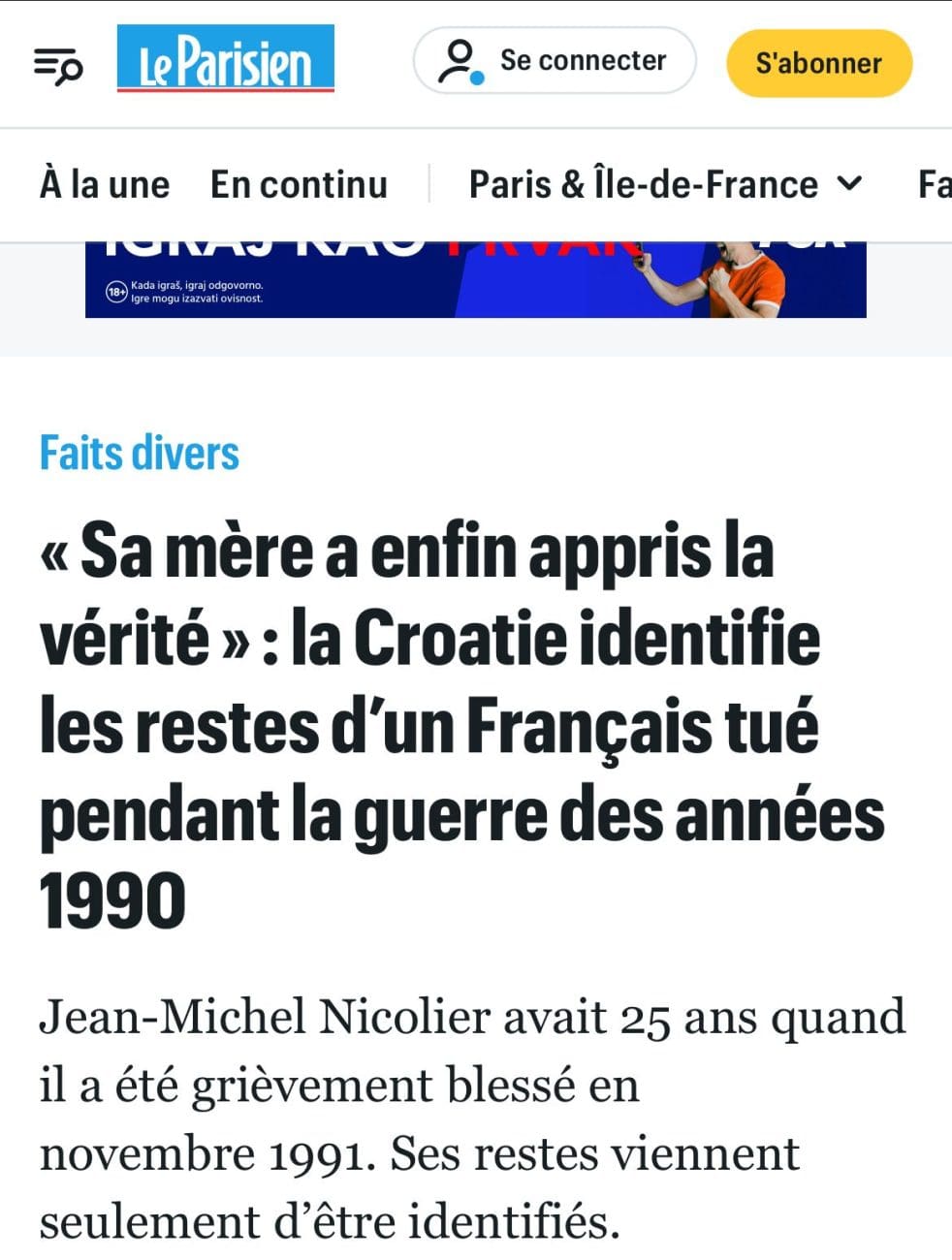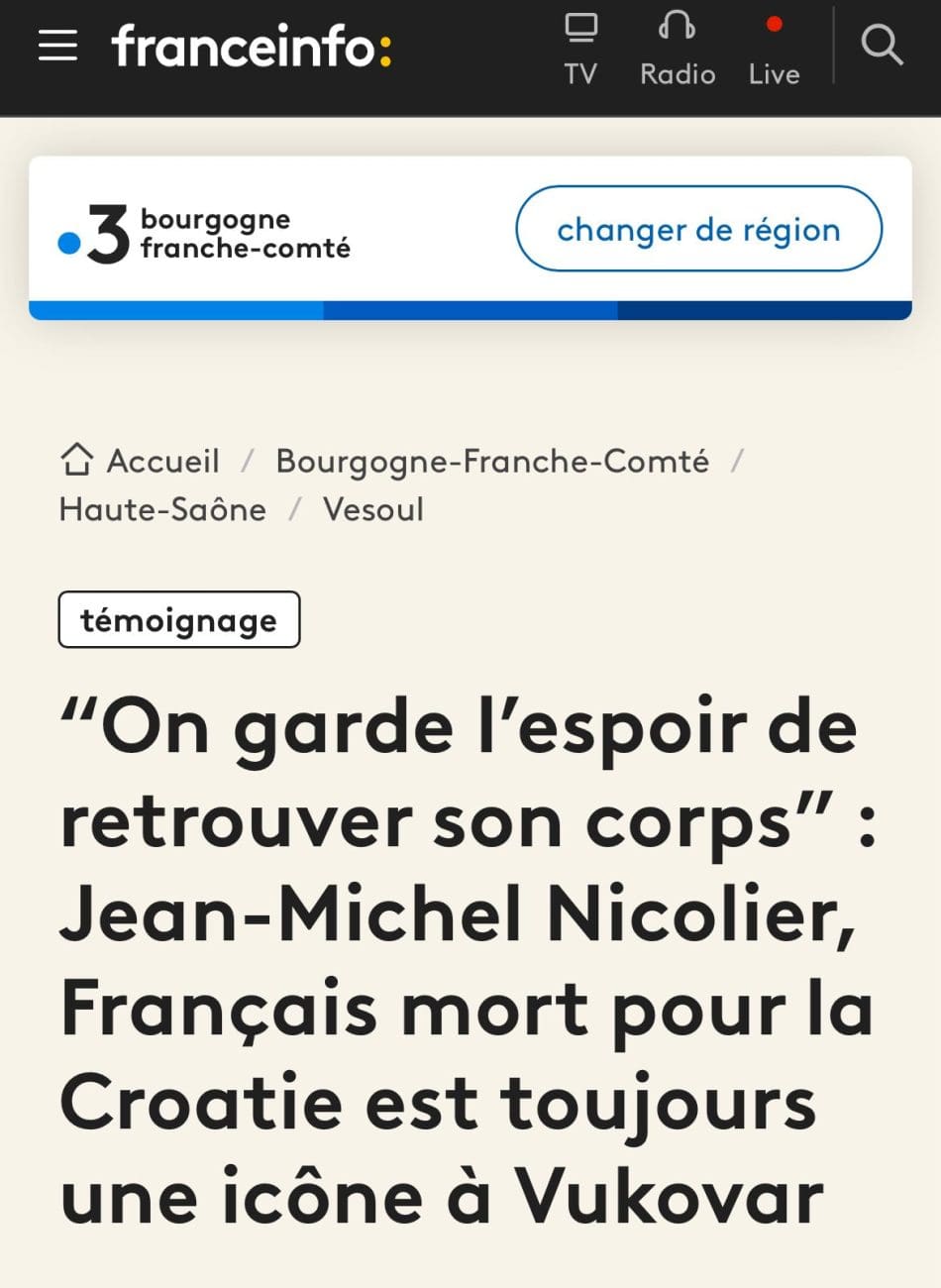 Le Télégramme, neovisni francuski dnevni list iz Bretanje poznat po uravnoteženom i humanističkom pristupu izvještavanju, piše kako je 34 godine nakon njegove smrti u Vukovaru Hrvatska identificirala posmrtne ostatke Jean-Michela Nicoliera, Francuza koji je 1991. došao braniti Hrvatsku.