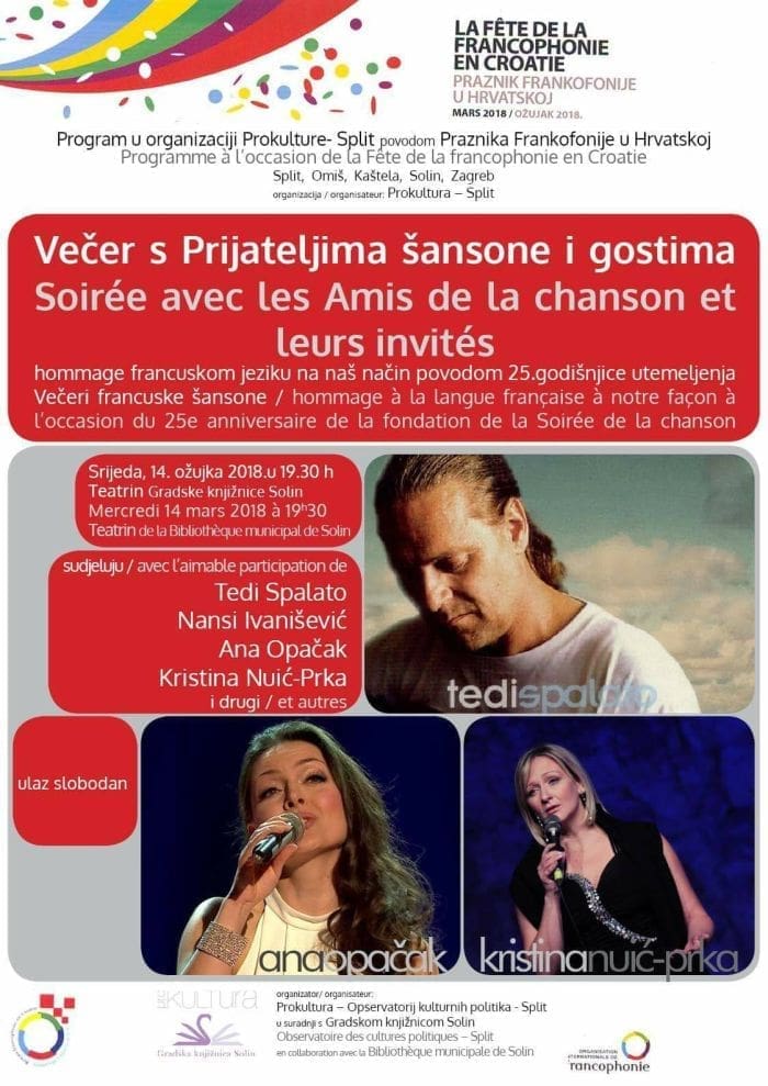 U sklopu te manifestacije Prokultura Split - Opservatorij kulturnih politika i Gradska knjižnica Solin organiziraju večeras 14. ožujka 2018. u 19:30 sati u Teatrinu Gradske knjižnice Solin glazbenu večer s Prijateljima šansone i gostima.