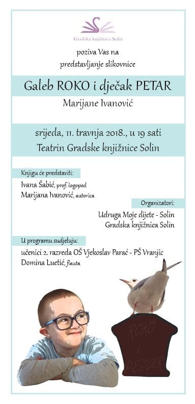 Gradska knjižnica Solin i Udruga Moje dijete Solin pozivaju na predstavljanje slikovnice "Galeb Roko i dječak Petar" Marijane Ivanović koje će se održati u Teatrinu Gradske knjižnice Solin u srijedu, 11. travnja s početkom u 19 sati.