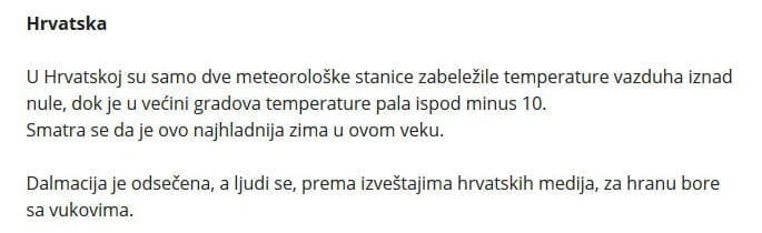 Neke vijesti o zimi idu toliko daleko da se više ne može biti siguran prepričava li se sadržaj filma "Dan nakon sutra", a ovaj način izvještavanja iznervirao je jednog novinara iz Srbije. Srpski TANJUG već danima javlja o jakoj zimi koja je pogodila jugoistočnu Europu, a dio izvještaja odnosio se na Dalmaciju.