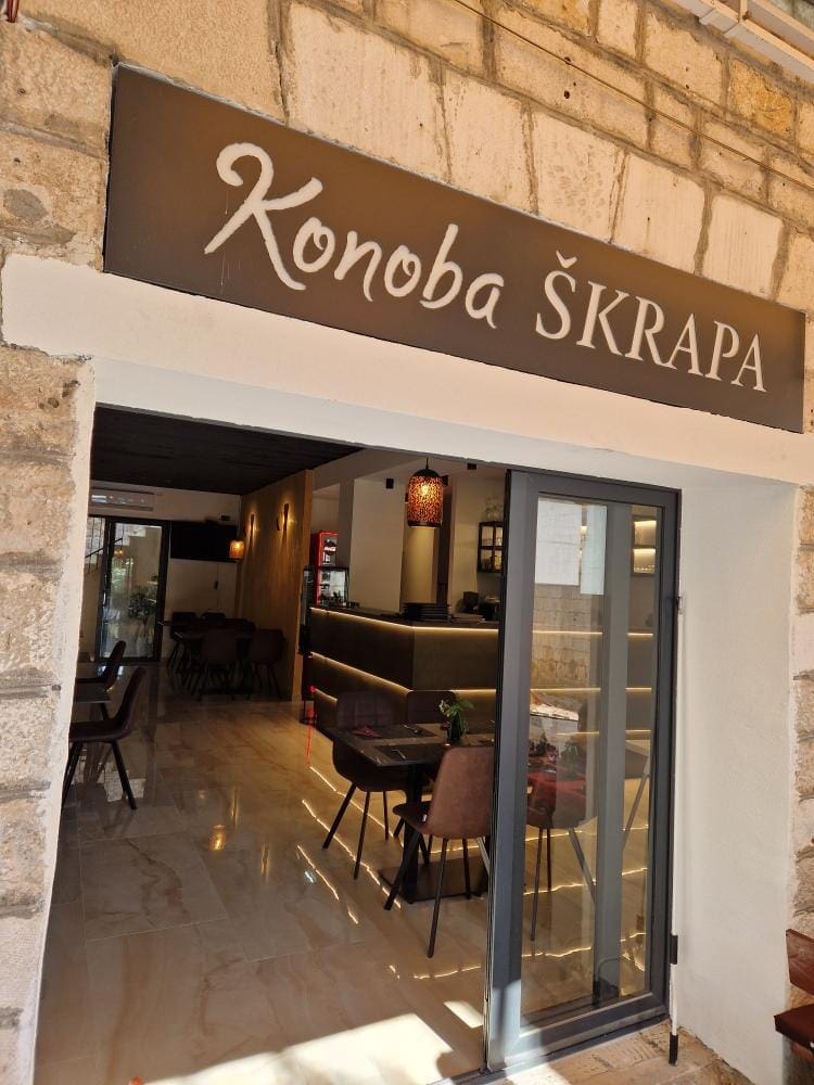 U samom srcu Trogira, na temeljima starog trogirskog bedema nasuprot poznatog pješačkog mosta smjestila se renovirana konoba “Škrapa”. Iako plijeni pažnju štekatom koji se nalazi u sjeni trogirskih zidina, prava ljepota ove konobe otkiva se tek ulaskom u njene prostore.