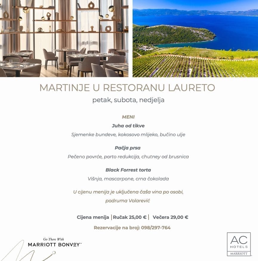 Naime, restoran Laureto kojeg predvodi poznati chef Goran Šikić od petka 10. studenog do nedjelje 12. studenog u ponudi će imati spektakularnu ponudu ručkova i večera po atraktivnim cijenama povodom Martinja.