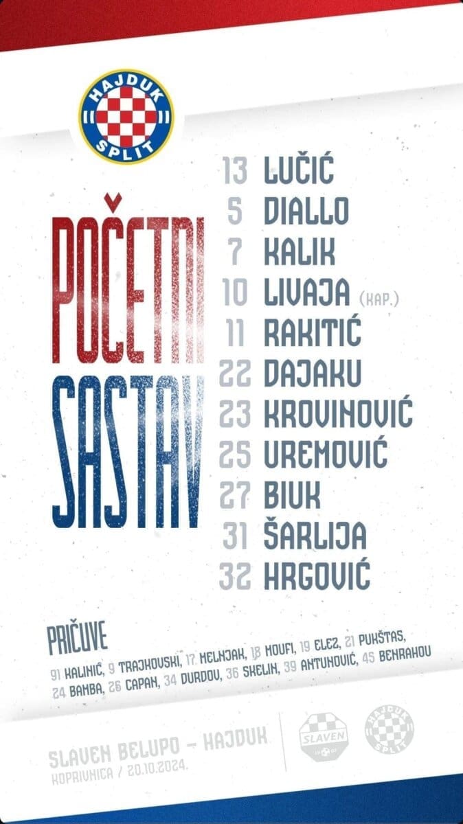 Što se tiče sastava, Slaven Belupo će na teren istrčati s formacijom koja uključuje Sušaka na golu, dok će Hajduk predvoditi Livaja, uz podršku Krovinovića i Rakitića u sredini terena.
