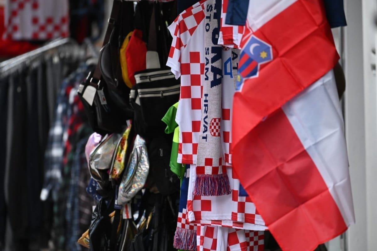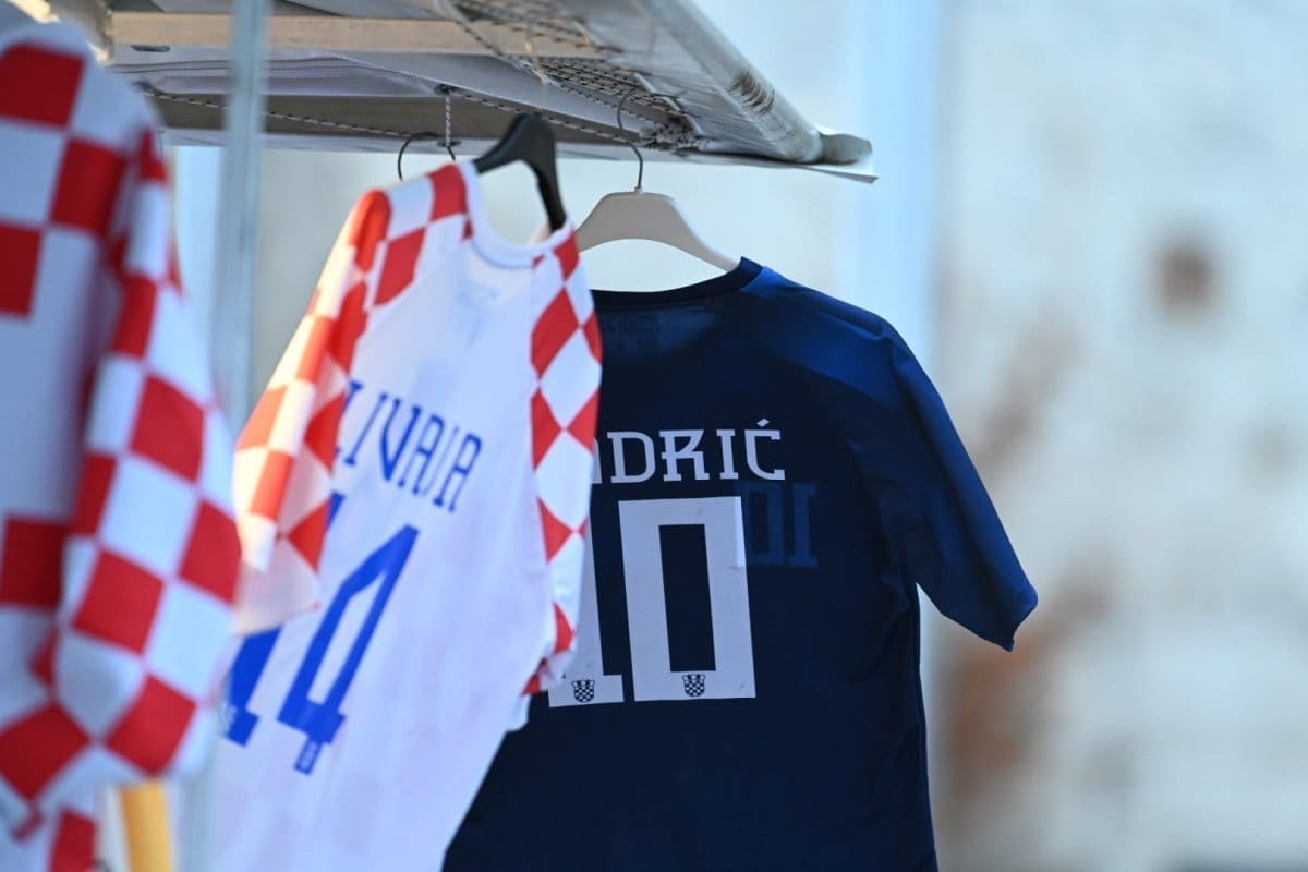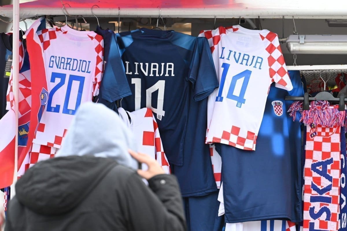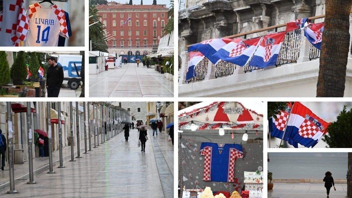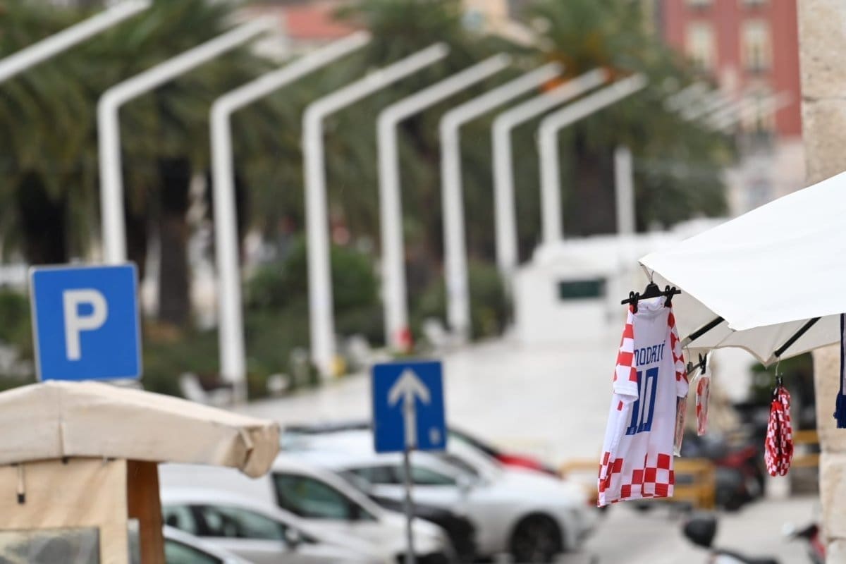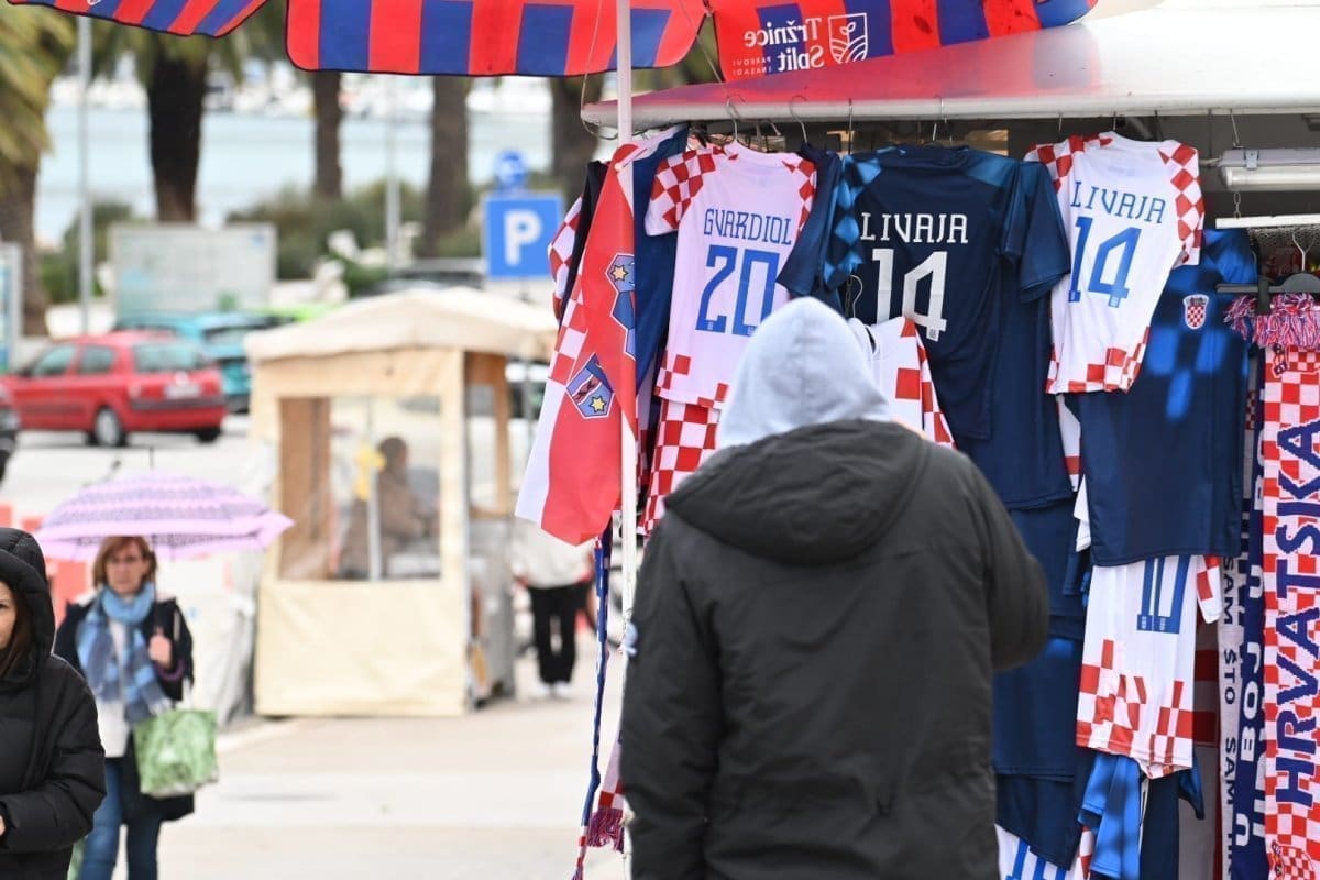 Kiša od ranih poslijepodnevnih sati pada u Splitu što je opustjelo splitske ulice, terase, štekate i kafiće. I splitski pazar je pust, ističu se samo štandovi u bojama hrvatske zastave. Kockice na majicama su postale jako prodavane zadnjih dana, a među najprodavanijim dresovima su Livajin, Modrićev i Gvardiolin dres.