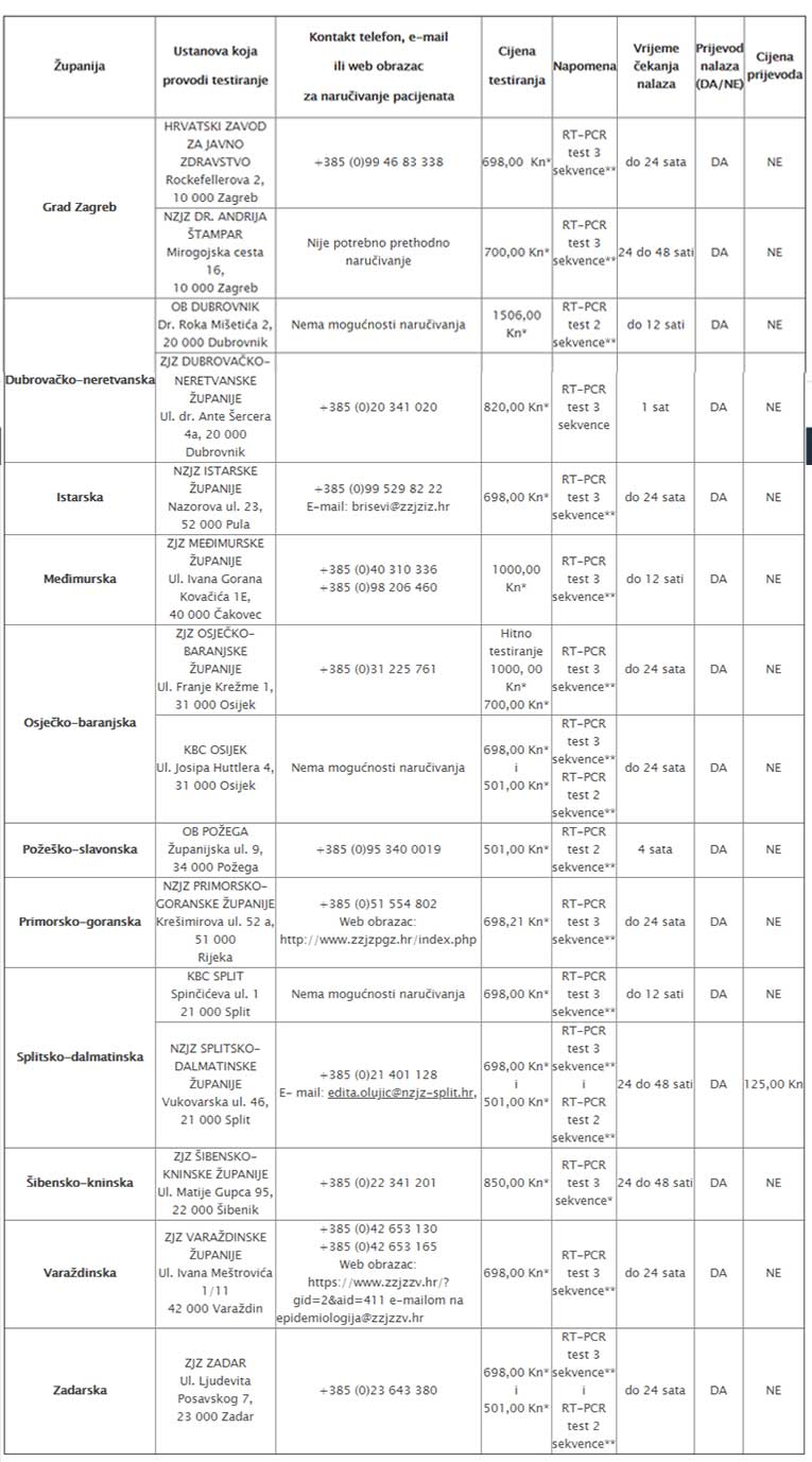 Na službenoj Vladinoj stranici koronavirus.hr objavljen je popis svih ustanova u Republici Hrvatskoj u kojima je moguće obaviti testiranje na COVID-19 na zahtjev. Testirati se možete u 11 županija, a cijene su od 500 do 1500 kuna.