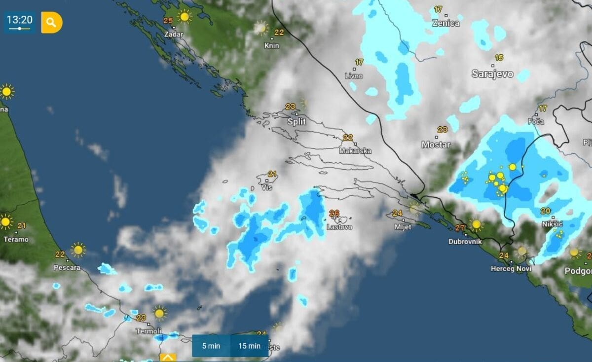 Najviše oblaka danas je bilo iznad srednje Dalmacije, a više sunca bilo je na sjeveru. Ne čudi stoga da su temperature zraka u ranim popodnevnim satima najniže u Zagori srednje Dalmacije. Tamo je od samo 17°C na području Vrgorca do 22°C na vrličkom području. Uz obalu su temperature većinom od 24 do 27°C.