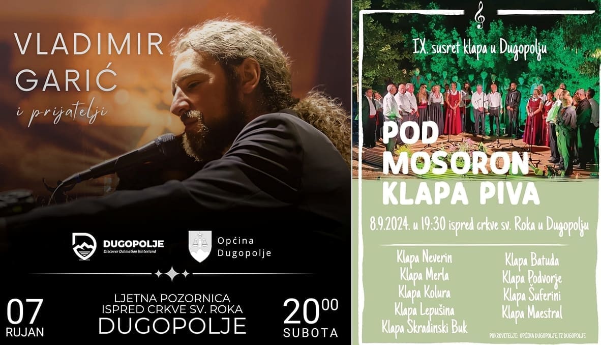 "Ovu subotu i nedjelju na ljetnoj pozornici kod crkve sv. Roka nastavljamo se zabavljati u ritmu evergreen i klapske glazbe! U subotu pod zvjezdanim nebom svojom izvedbom počastit će nas jedinstveni Vladimir Garić i prijatelji koji će izvoditi poznate šansone i evergreenove", objavio je na društvenim mrežama Perica Bosančić, načelnik Općine Dugopolje.