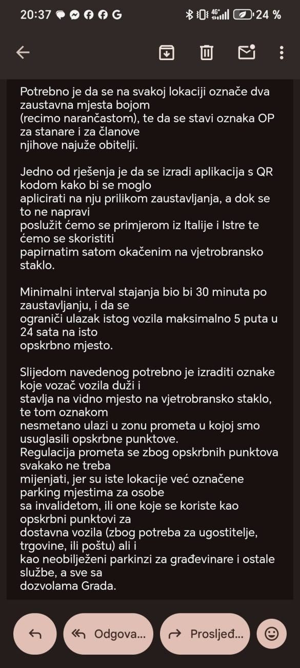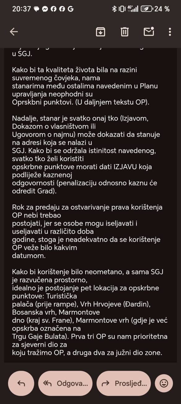"Moji su me susjedi ovlastili da u njihovo ime pošaljem ono što smo u nekih desetak dana zajedničkim snagama sastavili i ove nedjelje finalizirali. Imamo riječ gradske uprave da će nam odobriti ovo privremeno rješenje, a mi se nadamo da će oni napraviti onda prometnu studiju koja će uz pomoć i odobrenje policije doći do gradskog vijeće te da ćemo se za opskrbne punktove izboriti trajno, a ne da strahujemo tko se može pojaviti na vlasti i ukinuti nam ono što nam je za funkcioniranje života neophodno. Još jednom hvala momcima iz kafića D16 i Kale, koji su nas objeručke prihvatili da kod njih sastančimo dok su prostorije kotara na Rivi poplavljene", kratak je bio omiljeni splitski gimnazijski vjeroučitelj i stanar SGJ, prof. Jerko Župa.