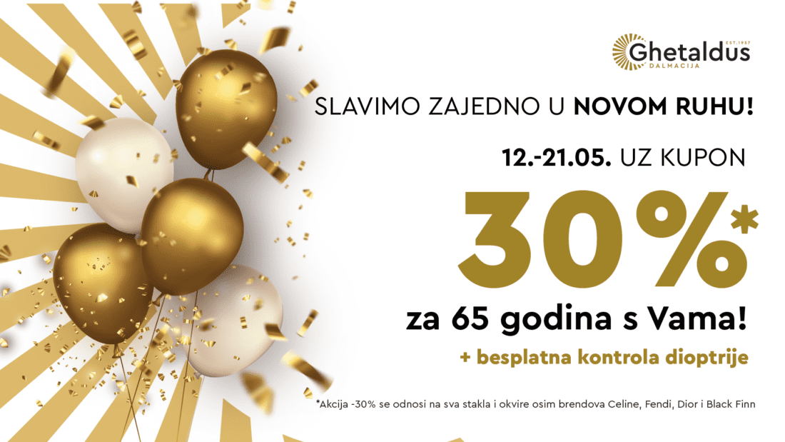 Oči su nam prozor u svijet, a i ne kaže se slučajno da osobu koju volimo čuvamo kao oči u glavi. Prepustite stručnjacima Ghetaldus Dalmacija brigu o vašim očima da biste neometano uživali u pogledu. Ulažući u stručni kadar, a održavajući najvišu razinu profesionalnosti s optimalnim materijalima izrade Ghetaldus Dalmacija u kontinuitetu već dugih 65 godina rade odmak na tržištu, a za rođendan su predstavili rebrendiranje ukazujući kako je potrebno stalno ići u korak s vremenom. Povodom slavlja 65. rođendana daruju -30% na asortiman (brendovi Celine, Fendi, Dior i Black Finn nisu dio ove akcije). Akcija od 30% popusta odnosi se i na stakla. Kako biste iskoristili popust, prilikom kupnje se pozovite na rođendansku akciju.