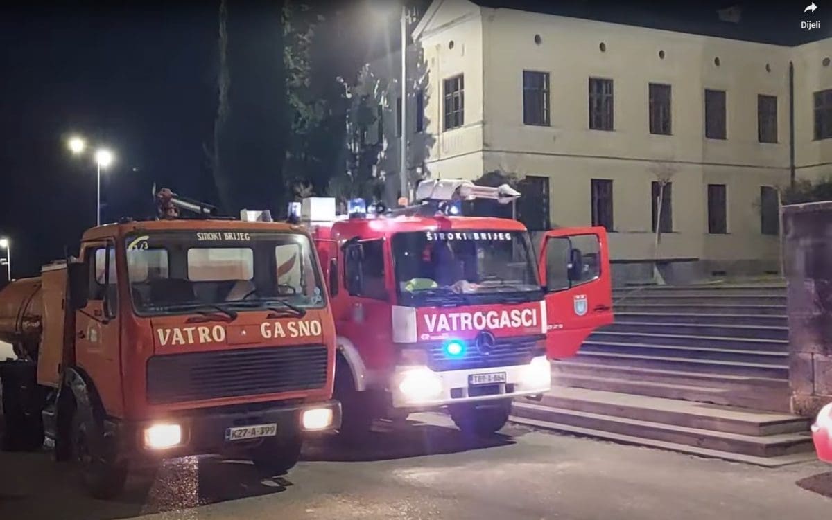Učenici Gimnazije fra Dominika Mandića i Srednje strukovne škole u Širokom Brijegu evakuirani su oko 19 sati nakon što je izbio veliki požar zbog kojega se urušio dio krova i stropa na posljednjem katu zgrade.