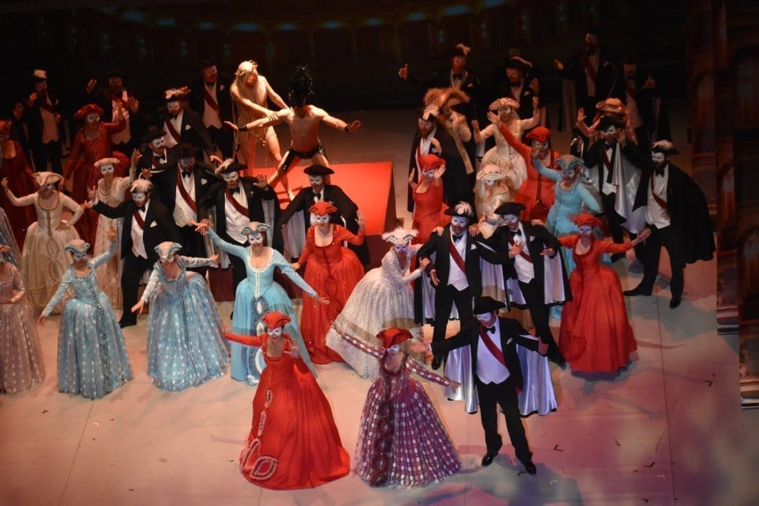 U prvome činu bogata nas basovska dionica uvodi u glorificiranje tipskog junaka i predstavlja grofa Riccarda (Max Jota), „pravednu vlast koja suši suze podanika“. Problem je što taj tipski junak prestaje biti tipičan zbog svoje zabranjene ljubavi. Već tu libretist Antonio Somma i Verdi čine salto mortale – šekspirijanski bi očekivano bilo da se nesretno zaljubljuje zapovjednikov vjerni pratitelj koji će morati birati između gospodarove časti i voljene žene, no u „Krabuljnom plesu“ lijepa je Amelia (Daniela Schillaci) supruga grofove desne ruke, vjernog Renata (Matija Meić). U sjajnom scenografskom rješenju portreti grofa Riccarda zlokobno vise sa svih strana, kao utvara nad Renatovim i Amelijinim brakom. Međutim, fama volat da se protiv Riccarda kuje urota, a u nedostatku dokaza kolektiv pribjegava romantičarski nevjerojatnim rješenjima – proročanstvima zloglasne Ulrice.