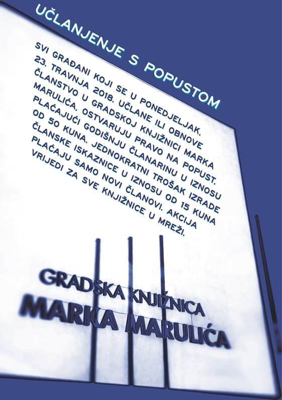 Svi građani koji se u ponedjeljak, 23. travnja 2018. učlane ili obnove članarinu u Gradsku knjižnicu Marka Marulića Split, ostvaruju pravo na popust, tako da godišnja članarina iznosi 50 kuna, a trošak izrade članske iskaznice 15 kuna.