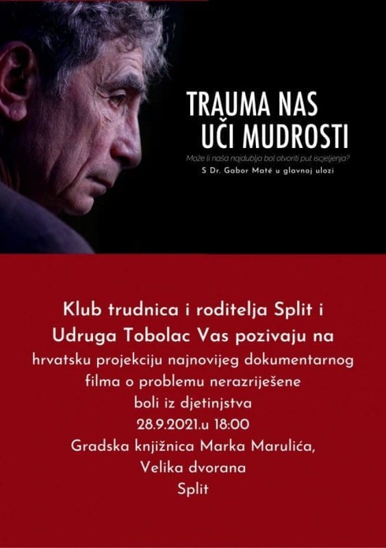 Nakon kratke prezentacije projekta (10 min) ćemo održati i jedinstvenu hrvatsku projekciju novog dokumentarnog filma „Trauma nas uči mudrosti“, s dr. Gabor Maté u glavnoj ulozi. Projekcija će se održati 28.9.2021. u 18:00 u Multimedijalnoj (Velikoj) dvorani Gradske knjižnice Marka Marulića u Splitu.