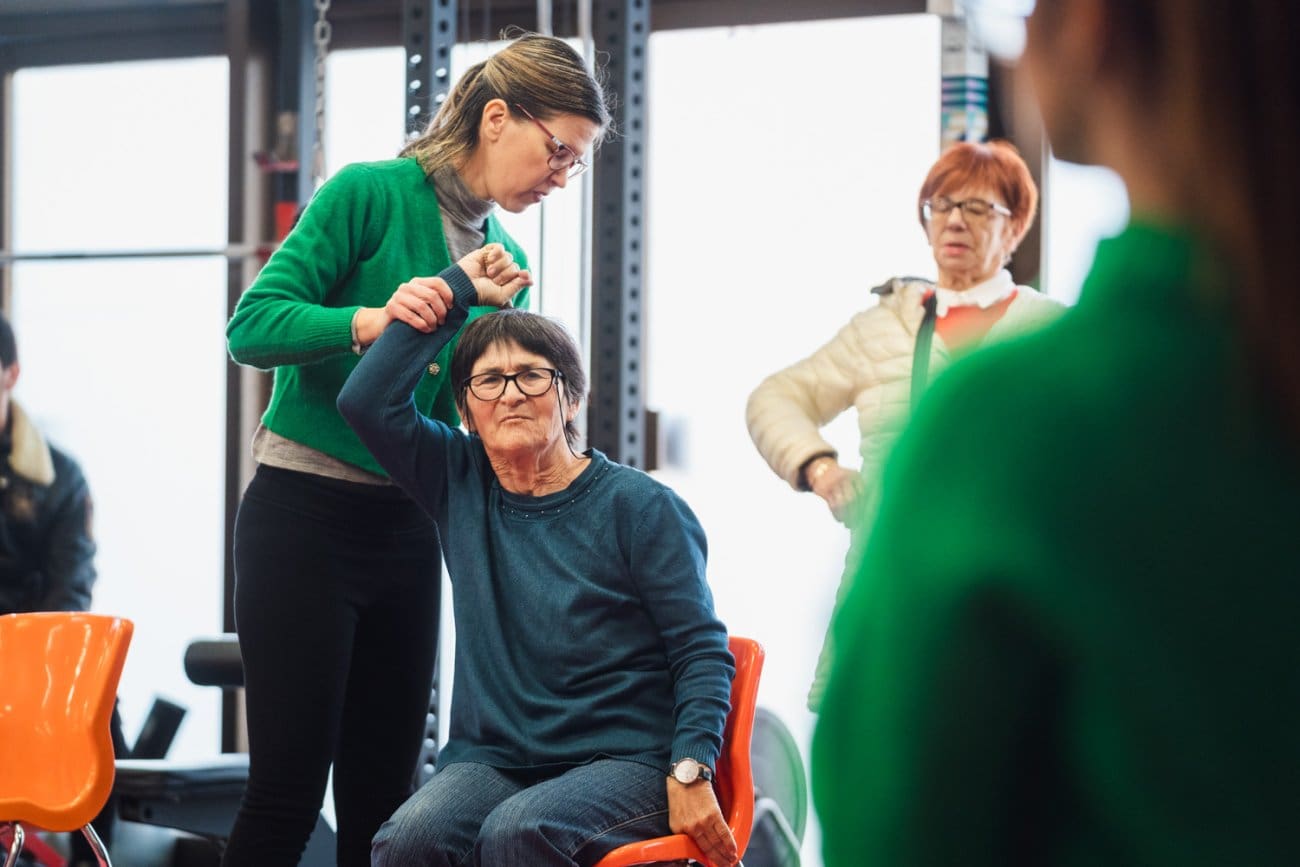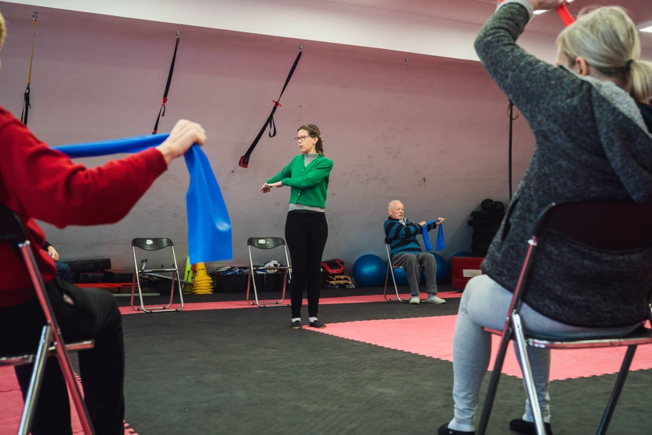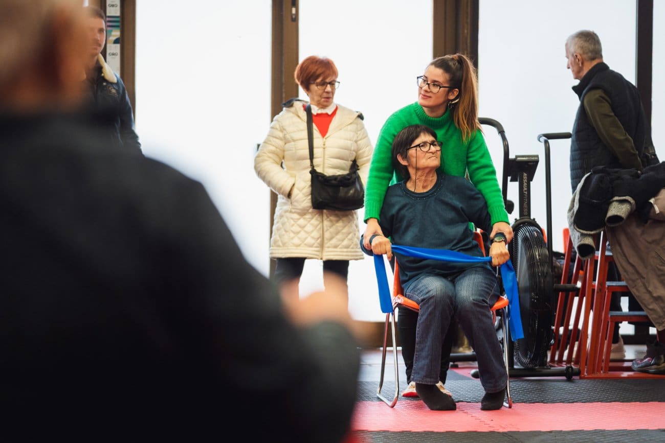 Nakratko prekidamo razgovor, otišla je naša sugovornica posvetiti se korisnicima, pokazati im kako ispravnije raditi vježbu. I slušamo kako ona sa svakim od 15-ak osoba u dvorani kratko i porazgovara – 'lipa moja', 'dušo', 'dragi moji', to je standardni vokabular tijekom vježbi…