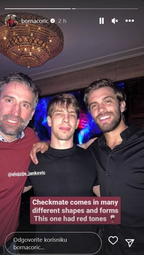 26- godišnji Ćorić ipak nije komentirao glasine o svojem ljubavnom životu, već je na svom InstaStoryu objavio fotografiju iz frizerskog salona i jednu na kojoj pozira s našim poznatim šahovskim velemajstorom Alojzijem Jankovićem.