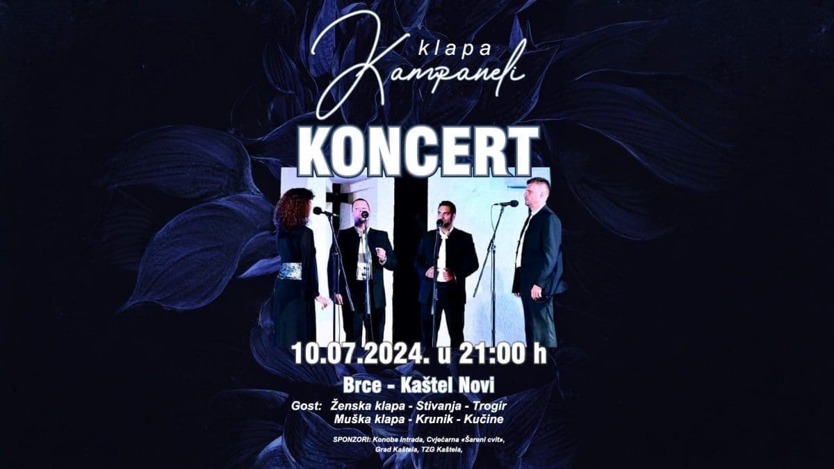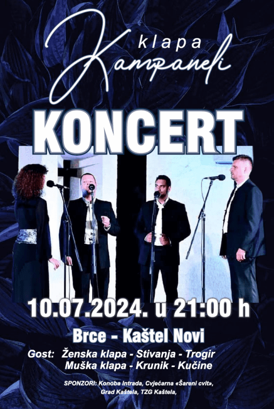 Koncert će se održi na lokaciji Brce u Kaštel Novome. Gosti koncerta su ženska klapa Stivanja iz Trogira i muška klapa Krunik iz Kučina.