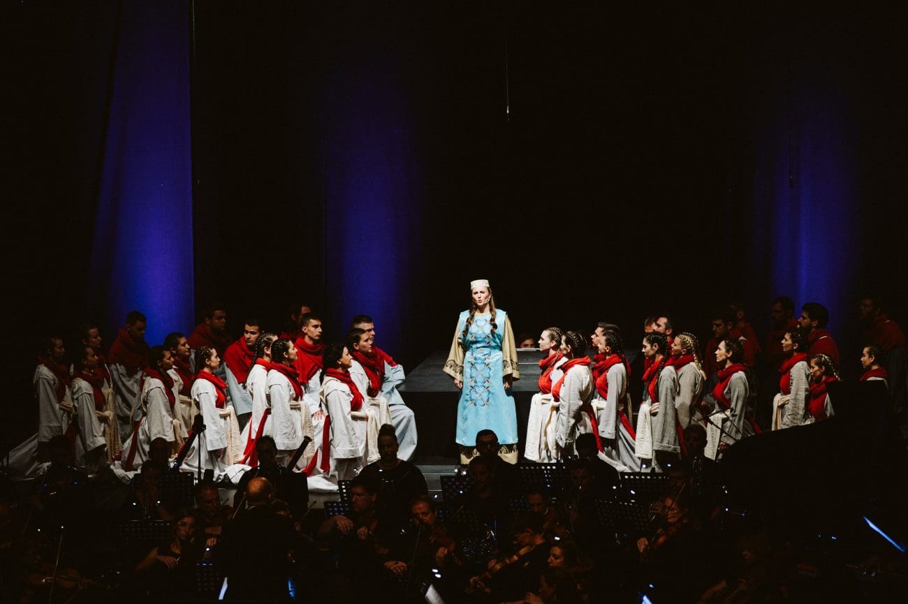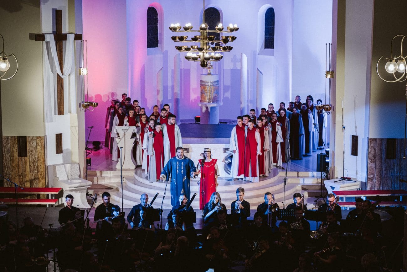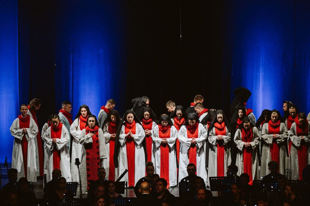 Kao solisti nastupaju operni solisti HNK u Zagrebu Roko Radovan, Josipa Bilić i Siniša Štork, a naratori su glumci mostarskog HNK Robert Pehar, Nikolina Marić, Ivo Krešić i Mirela Kordić, uz Orkestar HNK Split i Zbor HNK Mostar. Predstava je nastala u produkciji HNK Mostar.