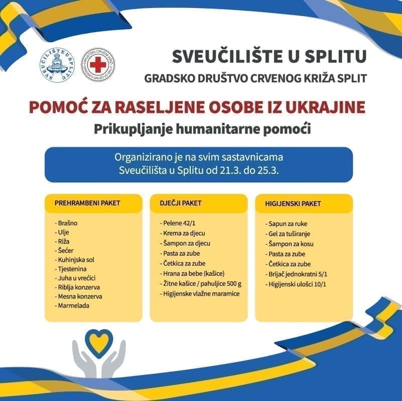 U suradnji s Gradskim društvom Crvenog križa Split, Sveučilište pokreće humanitarnu akciju prikupljanja prehrambenih proizvoda te higijenskih potrepština za odrasle i djecu pod nazivom; Pomoć za raseljene osobe iz Ukrajine.