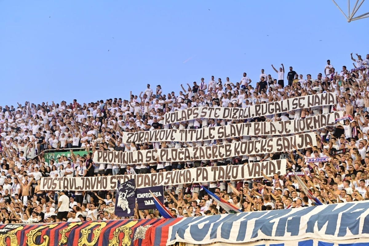 "Kolpas ste dizali. Rugali se nama, Zdravkove titule slavit bila je normala. Prominila se ploča, Zagreb kodeks sanja. Postavljamo standard svima i pa tako i vama", stoji na transparentu.