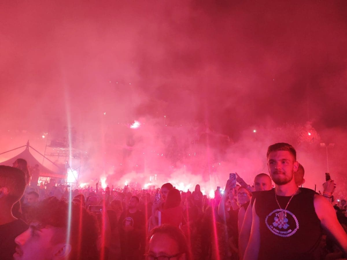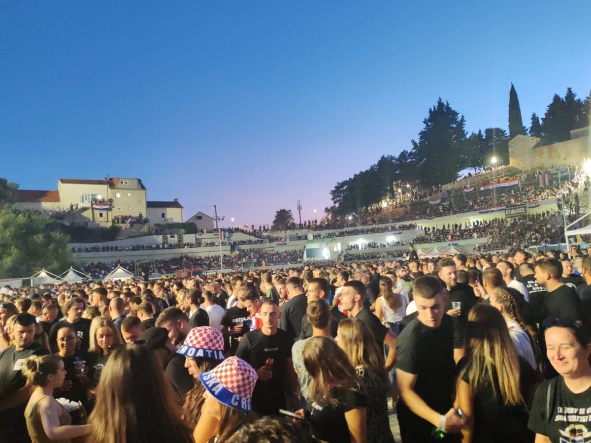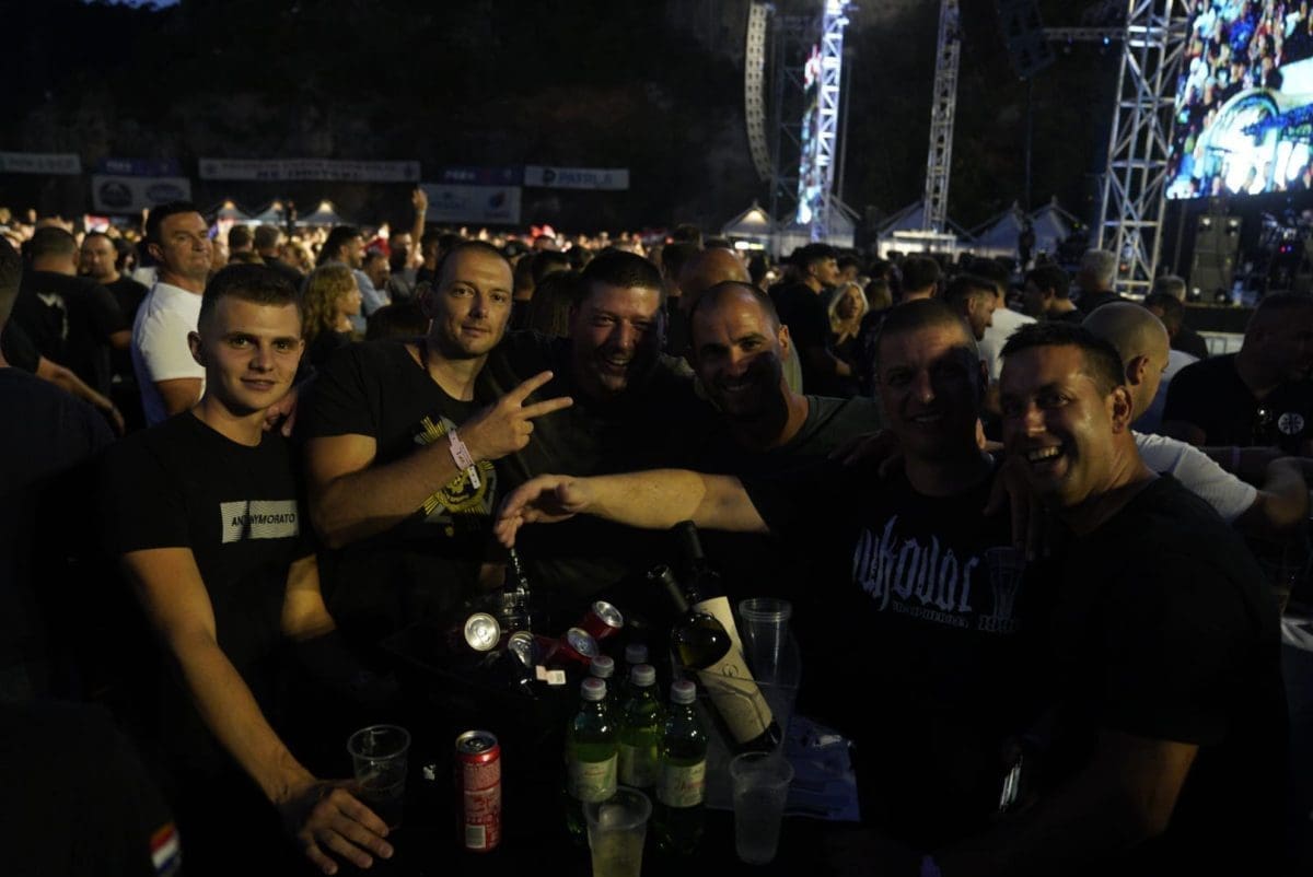 I dalje je velika gužva ispred ulaza i očekuje se dolazak Marka Perkovića Thompsona na pozornicu. Brojni posjetitelji se zabavljaju na svoj način i pjevaju domoljubne pjesme. Vijore se zastave i tu i tamo se zapali pokoja baklja.