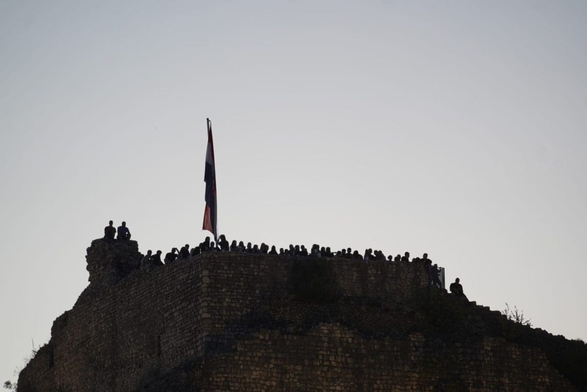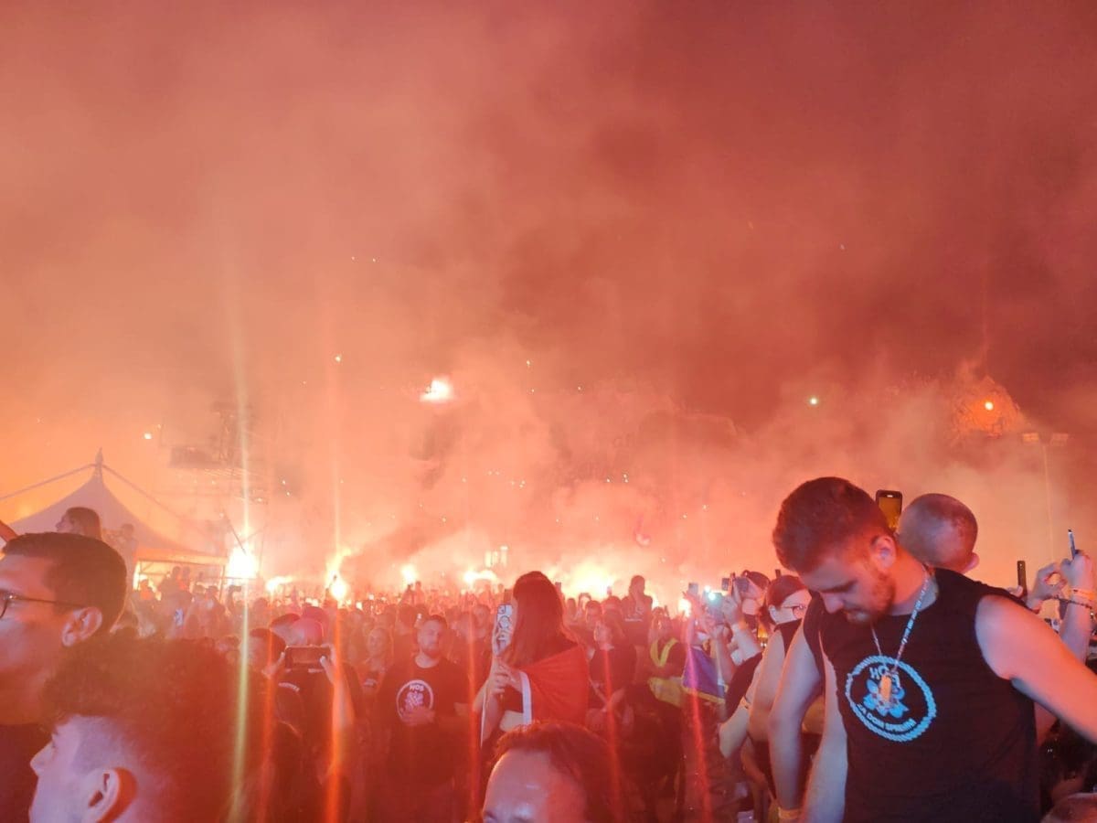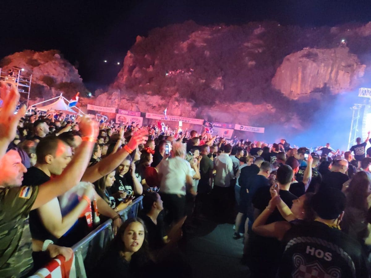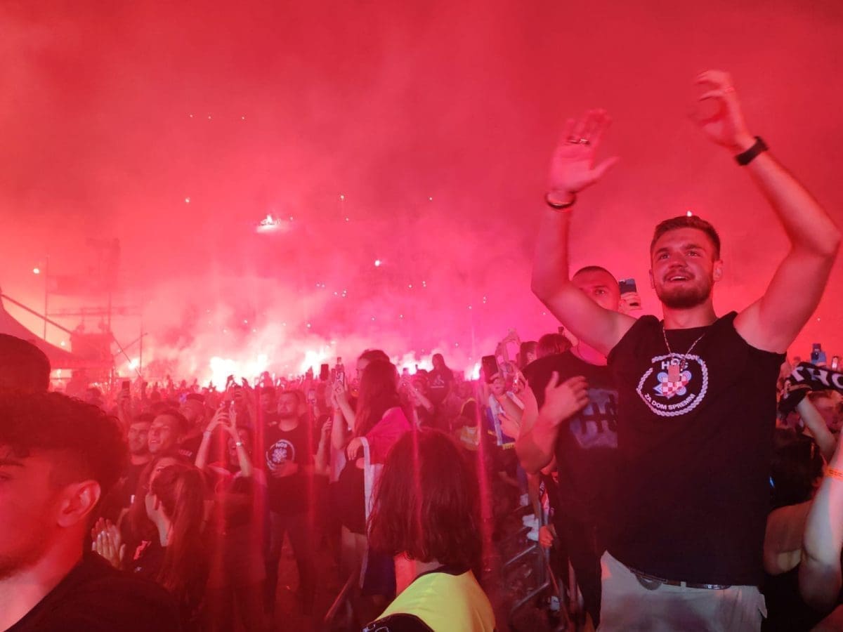 I dalje je velika gužva ispred ulaza i očekuje se dolazak Marka Perkovića Thompsona na pozornicu. Brojni posjetitelji se zabavljaju na svoj način i pjevaju domoljubne pjesme. Vijore se zastave i tu i tamo se zapali pokoja baklja.