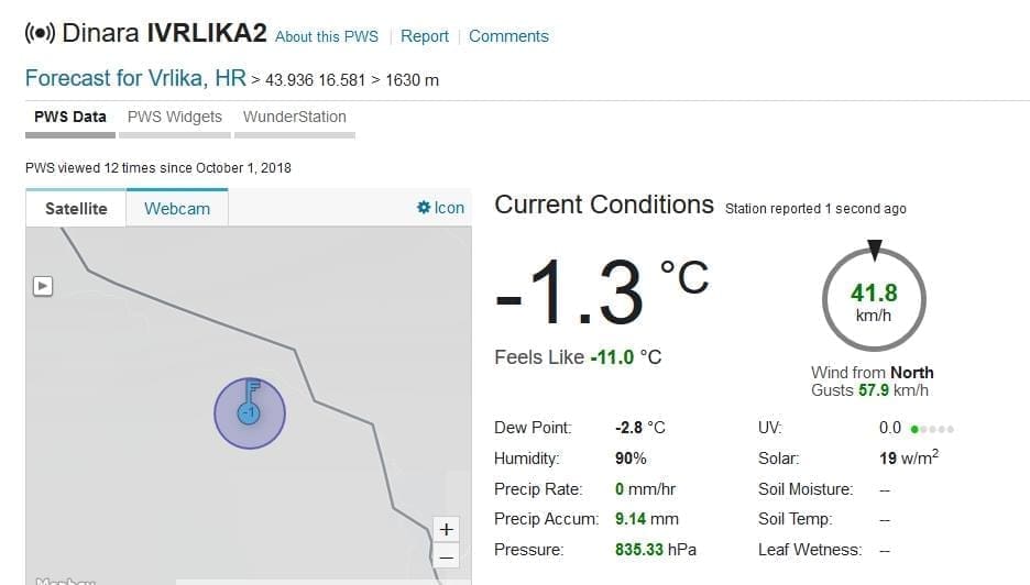 Već smo javili da je na Dinari i Kamešnici pao snijeg u predjelima iznad 1500 metara nadmorske visine. U nedjelju navečer temperatura se na Dinari spustila na -2°C, a uz buru osjet hladnoće je povremeno bio ispod -10°C. Na Svetom Juri na Biokovu temperatura je pala na 0°C. Tamo je također bilo padanja snijega, ali se nije uspio zadržati na tlu.