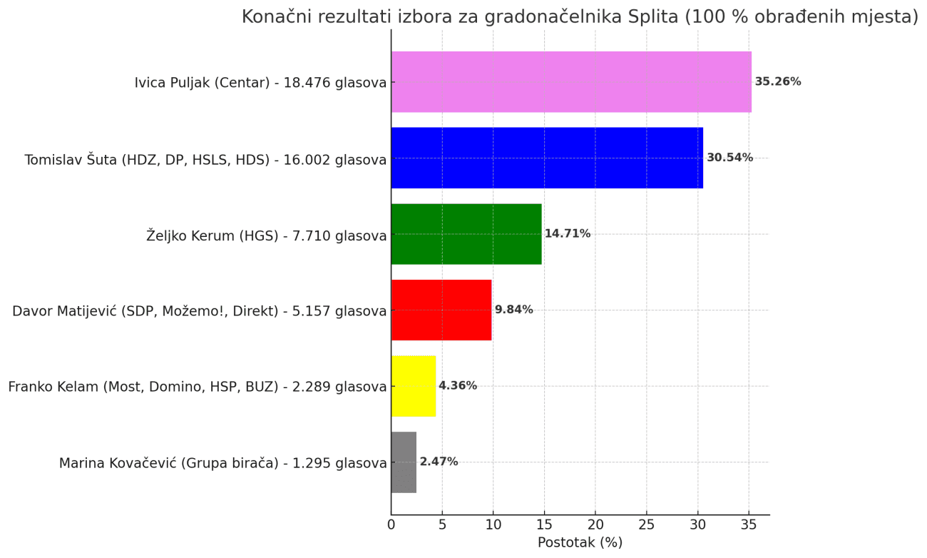 Prema konačnim rezultatima izbora za gradonačelnika Splita, nakon što su obrađena sva 163 biračka mjesta, u drugi krug idu Ivica Puljak (Centar) i Tomislav Šuta (HDZ, DP, HSLS, HDS). Na izbore je izašlo tek nešto više od 37 posto birača s pravom glasa, što predstavlja jednu od najnižih izlaznosti u povijesti splitskih lokalnih izbora.