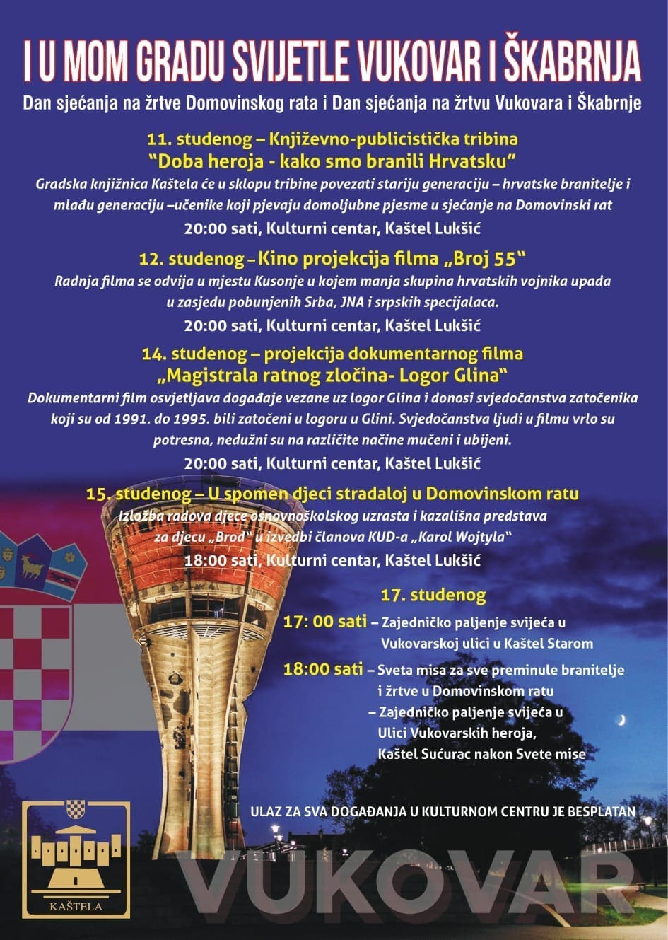 U sklopu obilježavanja Dana sjećanja na žrtve Domovinskog rata i sjećanja na žrtvu Vukovara i Škabrnje, Grad Kaštela organizira prigodni program pod nazivom „I u mom gradu svijetle Vukovar i Škabrnja“. Program donosi književnu večer, projekcije igranog i dokumentarnog filma, izložbu dječjih radova, predstavu, zajedničko paljenje svijeće uoči obljetnice pada Vukovara te svetu misu.
