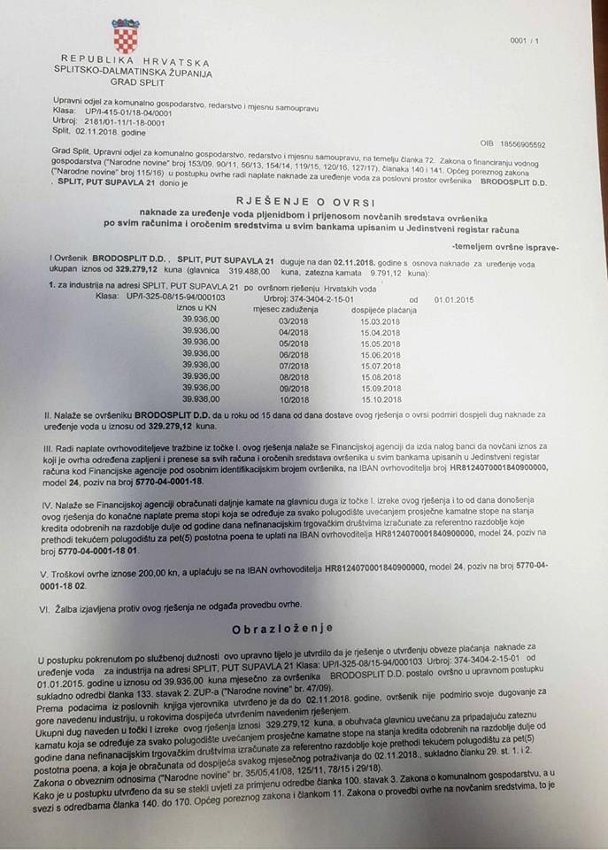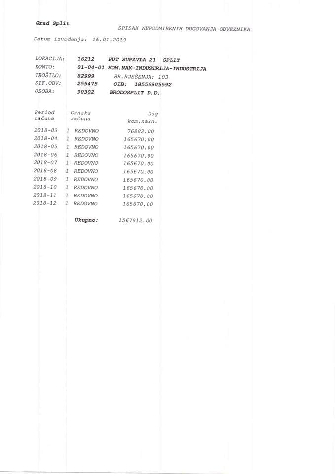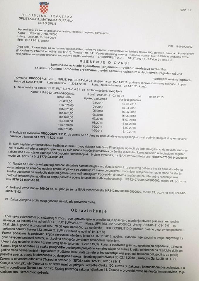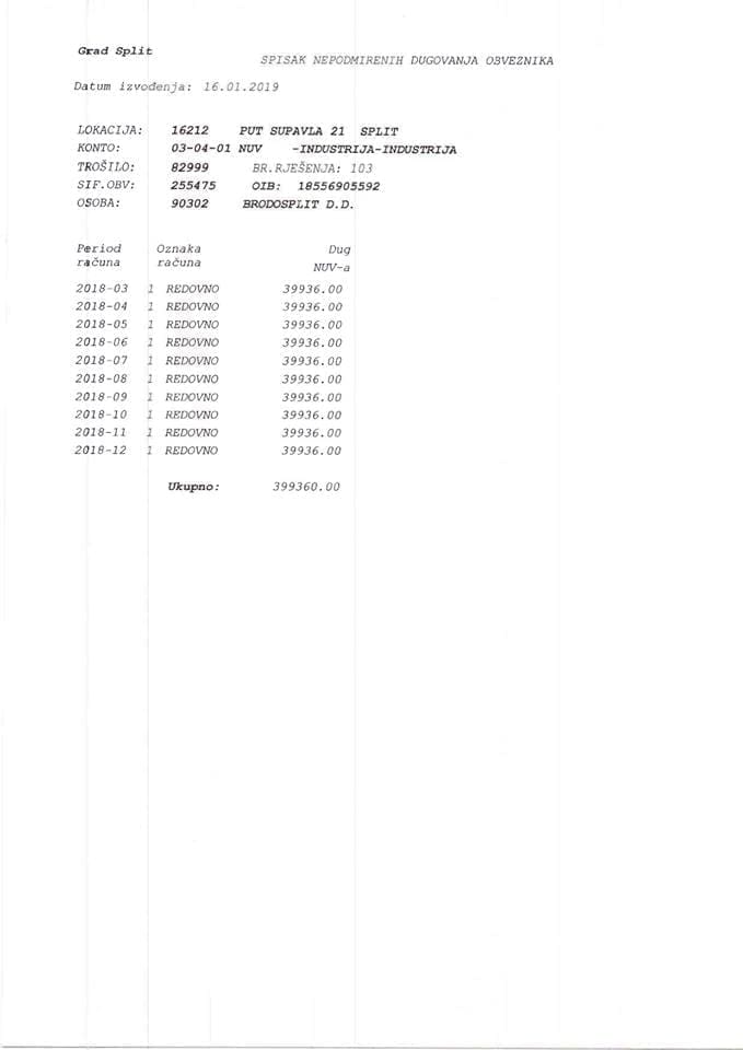 - Spominju se puste milijarde kuna koje bi kroz 10 godina u Uljanik uložio Brodosplit, a taj isti Brodosplit ne plaća redovito komunalnu naknadu gradu Splitu pa Grad mora pokretati ovršne postupke. Nije jasno je li Brodosplit nema novca ili mu nije stalo do Splita ili se jednostavno bahate. Bilo kako bilo evo kratke kronologije: