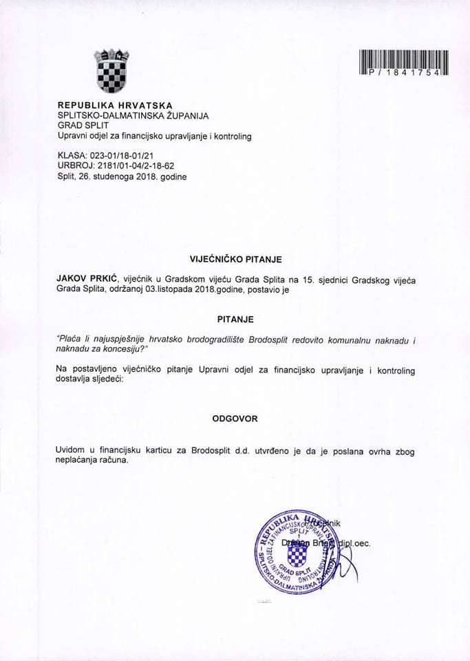 Nastavno na odluku o izboru Brodosplita za novog strateškog partnera Uljanika, splitski gradski vijećnik stranke Pametno, Jakov Prkić, objavio je svoje vijećničko pitanje i komentar o (ne)plaćanju komunalne naknade i naknade za koncesiju, i odgovor Grada Splita koji je ovršio Brodopslit radi neplaćanja iste: