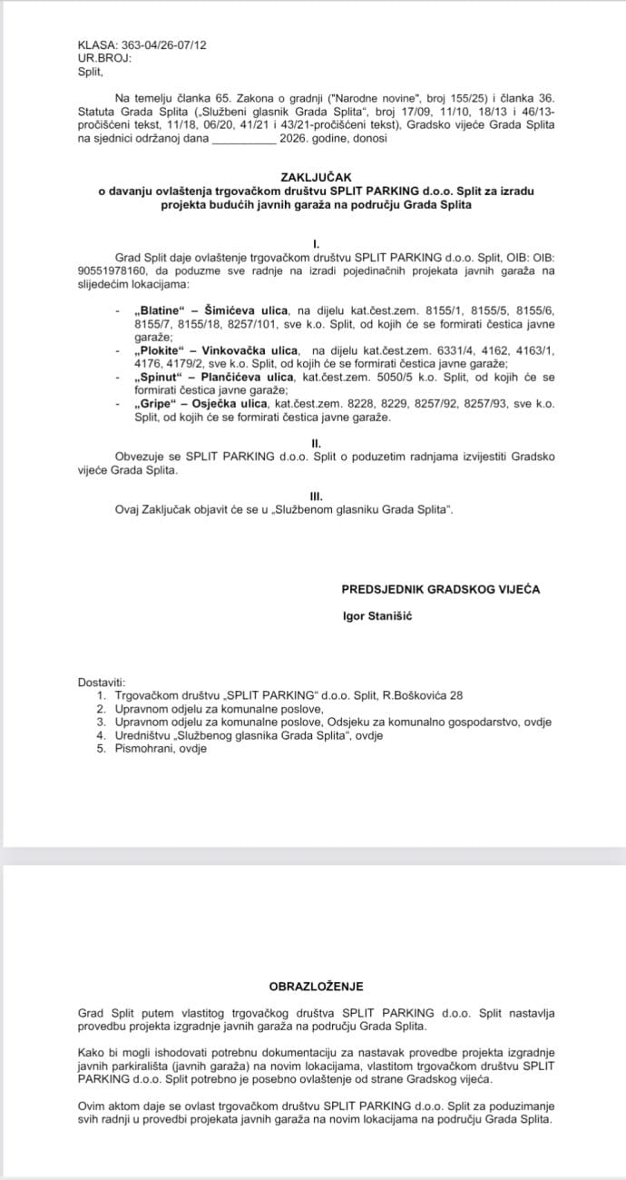 Ohrabruje činjenica što bi se buduća javna garaža na Plokitama gradila na gradskim zemljišnim česticama, koje se nakon odluke gradskog vijeća planiraju objediniti, no zbunjuje navođenje lokacije u VINKOVAČKOJ ulici, koja s navedenim česticama u prijedlogu ZAKLJUČKA za sjednicu Gradskog vijeća nema veze. Štoviše, ta lokacija u Vinkovačkoj je ona na kojoj Ivica Puljak nije uspio riješiti imovinsko-pravne odnose odnosno otkupiti privatni suvlasnički dio, jer se njemu i gradskim službama, procjena vrijednosti tog terena od strane sudskog vještaka činila previsokom i nerealnom.