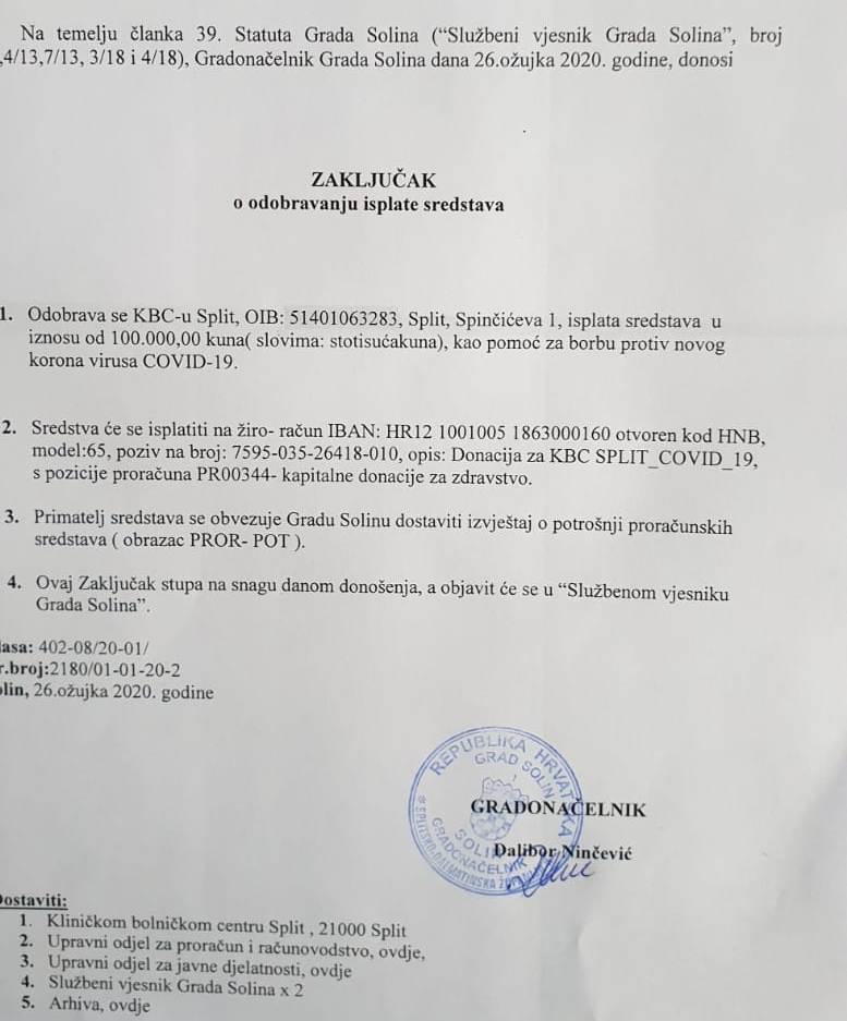 Gradonačelnik grada Solina Dalibor Ninčević danas (četvrtak 26. ožujka) je potpisao Zaključak o donaciji 100.000,00 kuna Kliničkom bolničkom centru Split za nabavku najpotrebnije medicinske opreme, respiratora.