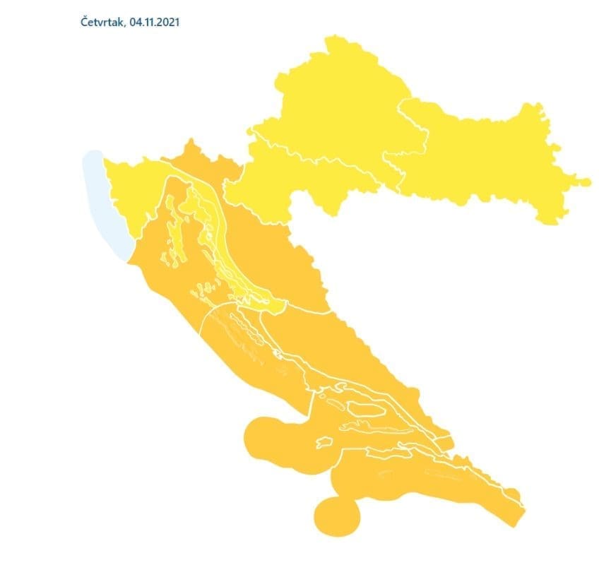 Jugo je u jačanju i već na moru ima olujne udare. Sljedećih sati vjetar će biti u stalnom jačanju. DHMZ je putem MeteoAlarma izdao narančasti stupanj upozorenja za Jadran zbog mogućih udara vjetra do 100 km/h, a očekuje se obilna kiša i grmljavinsko nevrijeme. Isto upozorenje vrijedi i za četvrtak.