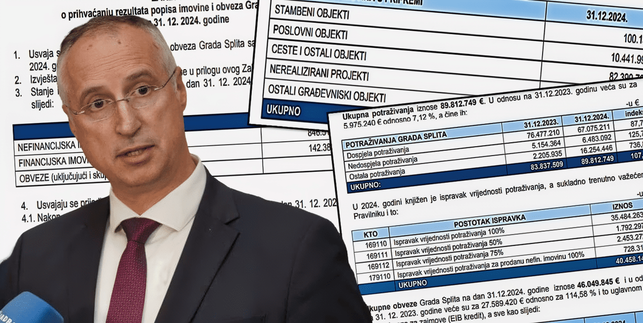 Gradonačelnik Splita, Ivica Puljak, donio je zaključak kojim se prihvaća izvještaj o popisu imovine i obveza Grada Splita za 2024. godinu. Izvještaj uključuje detaljan pregled svih imovine i obveza Grada na dan 31. prosinca 2024. godine, a poduzete su i mjere za daljnje usklađivanje i popis imovine. Prema ovom izvještaju, ukupna imovina Grada Splita na kraju prošle godine iznosila je 988.894.362,93 eura, od čega je nefinancijska imovina procijenjena na 846.512.079 eura, dok je financijska imovina bila 142.382.283 eura. U istom periodu, ukupne obveze Grada iznosile su 46.049.845 eura, što je značajan porast u odnosu na 2023. godinu, kada su obveze iznosile 21.460.425 eura.
