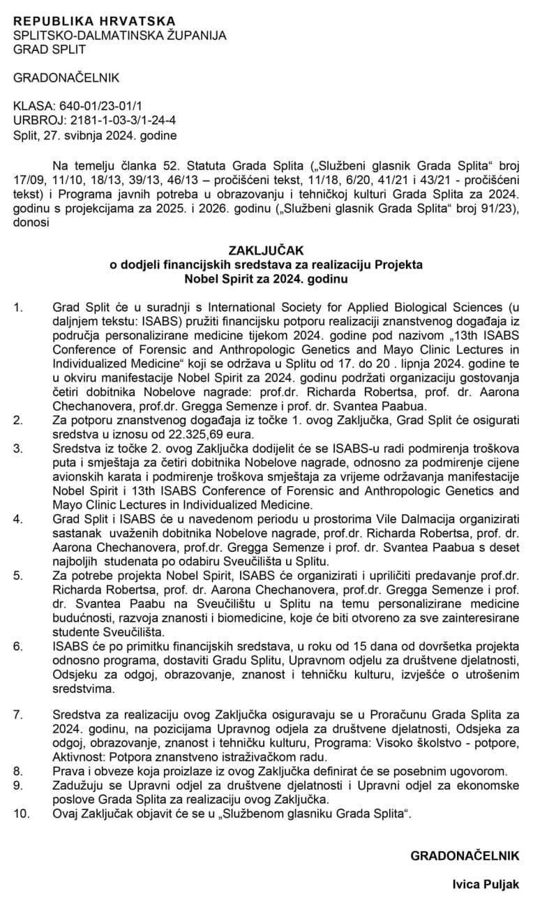 Grad Split ugostit će četiri dobitnika Nobelove nagrade u okviru prestižnog projekta Nobel Spirit 2024. Projekt uključuje konferenciju i javna predavanja na temu personalizirane medicine i biomedicine. U organizaciji Grada Splita i International Society for Applied Biological Sciences (ISABS) manifestacija će se održati od 17. do 20. lipnja 2024. godine u Splitu, u sklopu "13th ISABS Conference of Forensic and Anthropologic Genetics and Mayo Clinic Lectures in Individualized Medicine."
