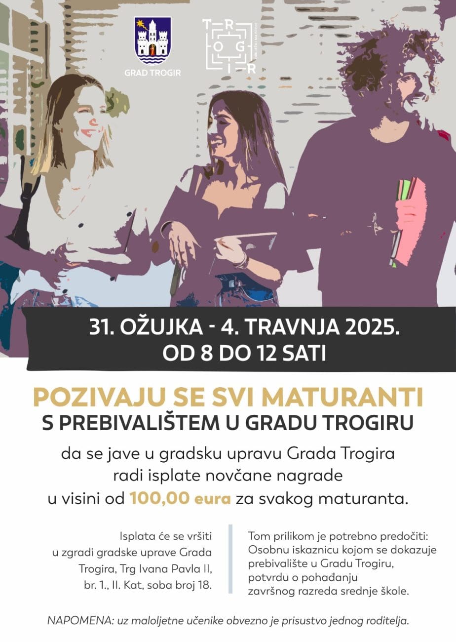 Grad Trogir drugu godinu za redom dodijelit će po 100 eura potpore za sve maturantice i maturante. Praksa je uvedena lani u cilju da se roditeljima maturanata i samim maturantima olakša razdoblje prelaska iz srednjih škola na fakultete i na tržište rada.