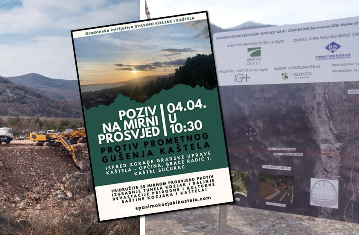 "Pridružite nam se u mirnom prosvjedu ispred zgrade Gradske uprave u Kaštelima na adresi Braće Radić 1 (Općina) u Kaštel Sućurcu. Mirni prosvjed se organizira zbog najavljene izgradnje tunela Kozjak i devastacije prirode i kulturne baštine Kaštela", otkrivaju iz Građanske inicijative "Spasimo Kozjak i Kaštela".
