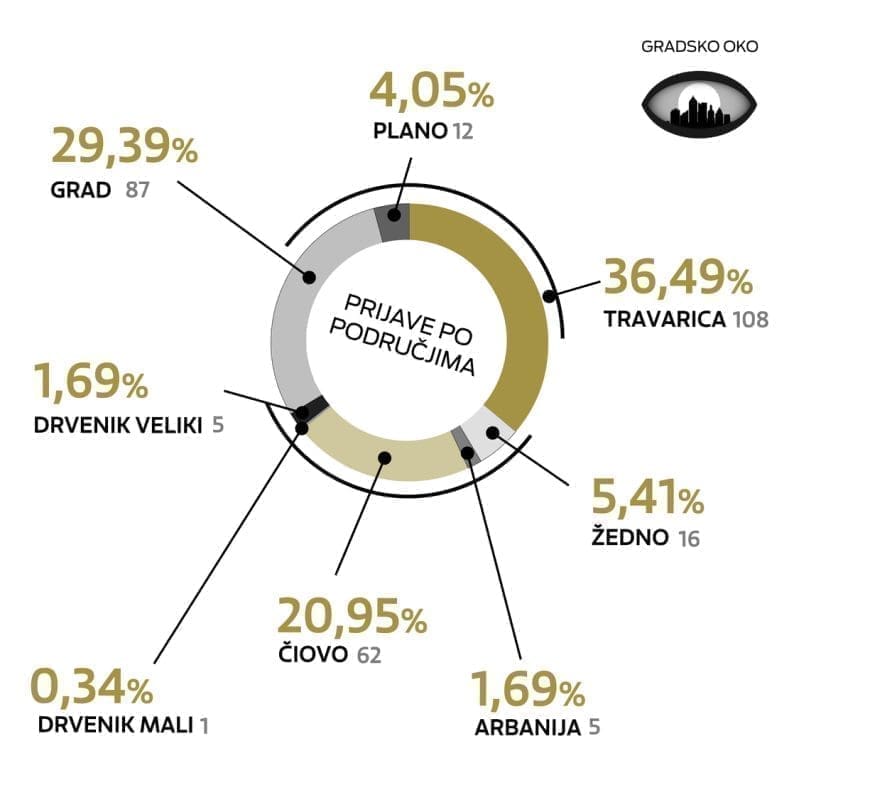 Najviše se prijava odnosilo na komunalne probleme, 81,27 posto, slijede prometni problemi na koje otpada 14,05 posto prijava, 3,68 posto prijava odnosi se na čistoću, a jedan posto su pohvale službama za brzo obavljen posao. Najviše prijava, 36,49 odnosilo se na predio Travarice, inače i najnaseljeniji trogirski mjesni odbor, 29,39 posto na jezgru, a 20,95 posto prijava ticalo se komunalnih, prometnih i infrastrukturnih problema na Čiovu. Najviše se prijava odnosilo na oštećenja javnih površina (15%) i javnu rasvjetu (15%), a slijede prijave vezane uz građevinsku inspekciju (10%) i održavanje gradskih cesta (10%).