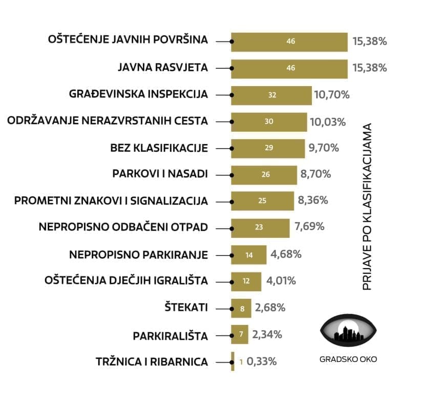 Najviše se prijava odnosilo na komunalne probleme, 81,27 posto, slijede prometni problemi na koje otpada 14,05 posto prijava, 3,68 posto prijava odnosi se na čistoću, a jedan posto su pohvale službama za brzo obavljen posao. Najviše prijava, 36,49 odnosilo se na predio Travarice, inače i najnaseljeniji trogirski mjesni odbor, 29,39 posto na jezgru, a 20,95 posto prijava ticalo se komunalnih, prometnih i infrastrukturnih problema na Čiovu. Najviše se prijava odnosilo na oštećenja javnih površina (15%) i javnu rasvjetu (15%), a slijede prijave vezane uz građevinsku inspekciju (10%) i održavanje gradskih cesta (10%).
