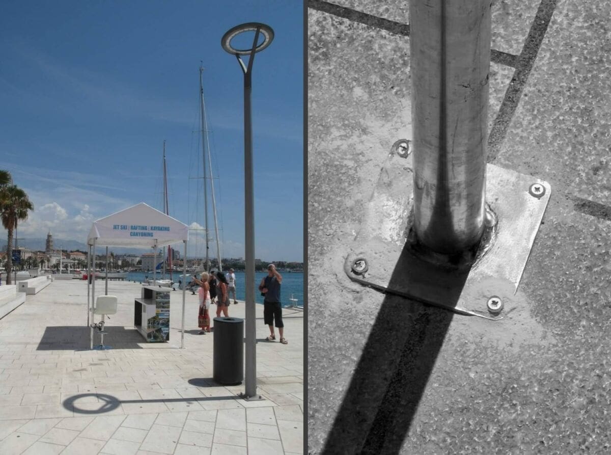 Ovim putem htjeli bismo vam obratiti pozornost na najnoviji sramotni ispad jednog poduzetnika novog kova. Dotični je dobio dozvolu od strane Splitske obale da postavi štand s nadstrešnicom nasred novoizgrađene šetnice koju smo mi (Grad Split) platili 17 milijuna kuna kako bi povezali Rivu, Matejušku i Zapadnu obalu u jednu cjelinu, a gospodinu se omakao šator bez dozvole za čije je potrebe izbušio 16 rupa na šetnici od čega 10 u kamenu, a šest u fugama.