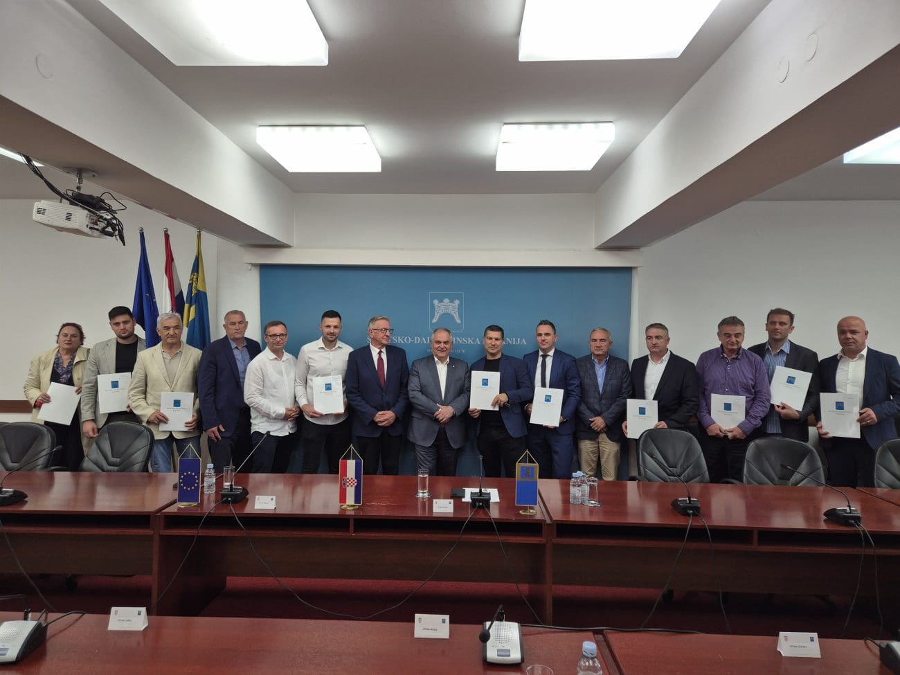 Župan Splitsko-dalmatinske županije Blaženko Boban zajedno s Željkom Primorcem, pročelnikom Upravnog odjela za kulturu, sport i tehničku kulturu, u četvrtak je potpisao ukupno 15 ugovora s gradonačelnicima gradova i načelnicima općina u okviru programa 100 sportskih, putem kojega Županija osigurava sredstava pomoći jedinicama lokalne samouprave uređenje i izgradnju sportskih objekata na području Splitsko-dalmatinske županije.