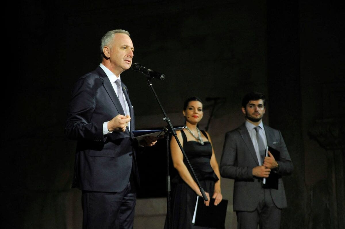 Dame i gospodo, prošle godine sam u govoru na otvaranju Splitskog ljeta obećao povratak „Nabucca“ na Peristil uz tradicionalnu „Aidu“, kao i ponovnu umjetnost pučkog, temperamentnog i mediteranskog teatra u srcu Palače, na Carrarinu poljanu, na radost preostalih stanovnika. Također, nakon dugo godina smo opet na Mosoru s antičkom dramom, naglašavam, uz želju i trud dičnih Poljičana.