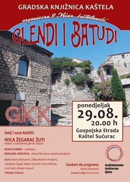 Gradska knjižnica Kaštela organizira 8. Večer kaštelanski’ glendi i batudi u ponedjeljak 29. kolovoza u 20 sati u Gospojskoj štradi u Kaštel Sućurcu.