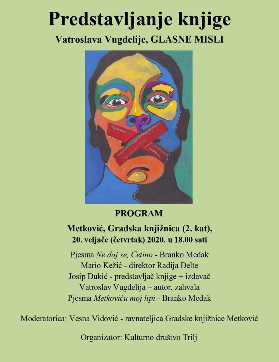 Sutra, 20. veljače u 18 sati, u metkovskoj Gradskoj knjižnici će se održati predstavljanje knjige Glasne misli, autora Vatroslava Vugdelije.
