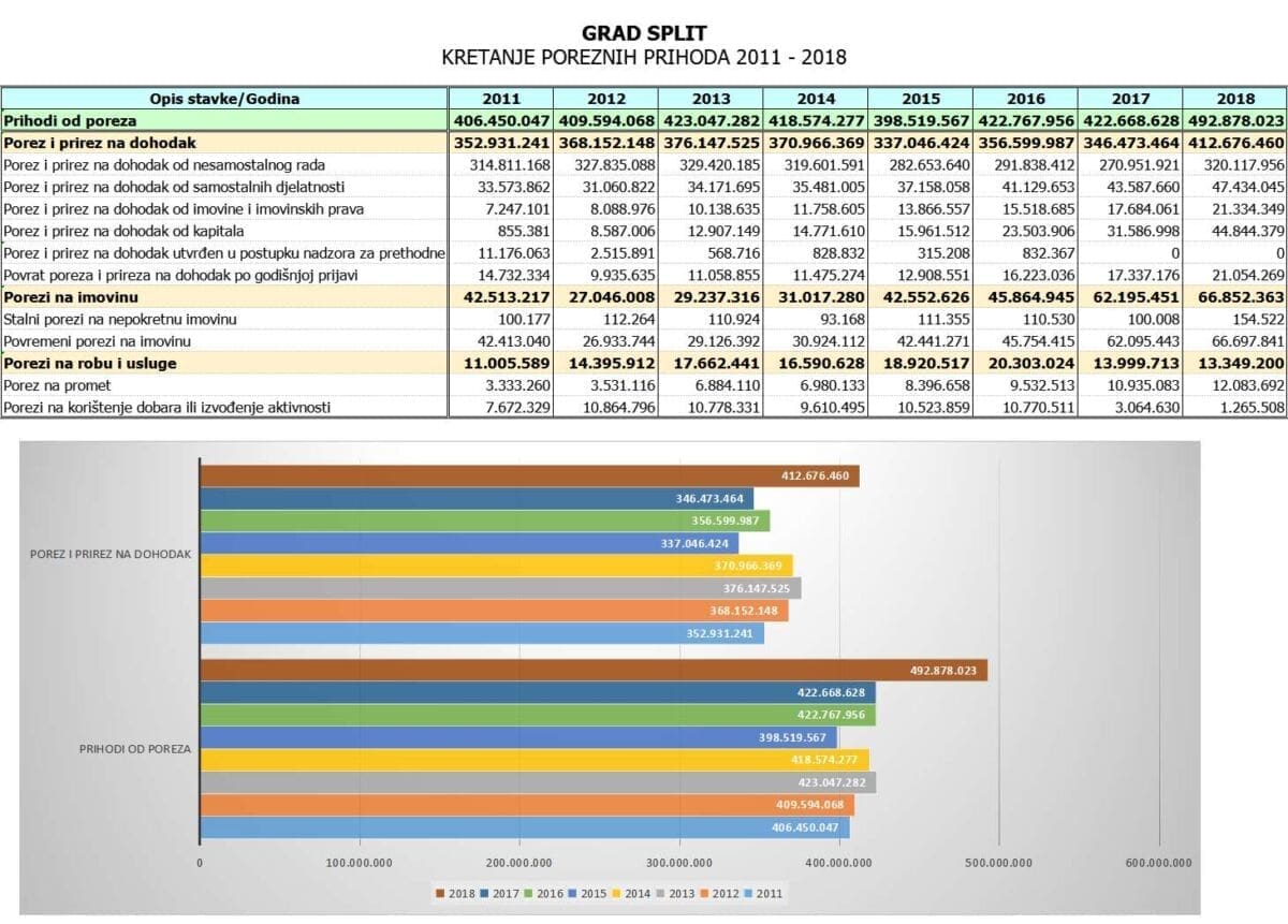 - Prema svim pokazateljima Grad Split je u prošloj godini od poreza i prireza na dohodak uprihodio više od predviđenog proračunom. Isti prihodi su za 66,2 milijuna kuna veći od onih u 2017.g i za cca 35,5 milijuna kuna veći od predviđenih. Prilikom podizanja stope prireza sa 10% na 15% očekivao se efekt od cca. 60 milijuna kuna godišnje. Tako je pisalo u obrazloženju zahtjeva za podizanjem. U 2017.g. prirez je u gradsku kasu donio 51 milijun kuna ( zadnja dva mjeseca su bila sa stopom od 15%). U prošloj godini uprihođeno je 79,4 milijuna kuna samo od prireza. Većim poreznim prihodima od dohotka dobrim dijelom je pridonijela i poboljšana gospodarska aktivnost.