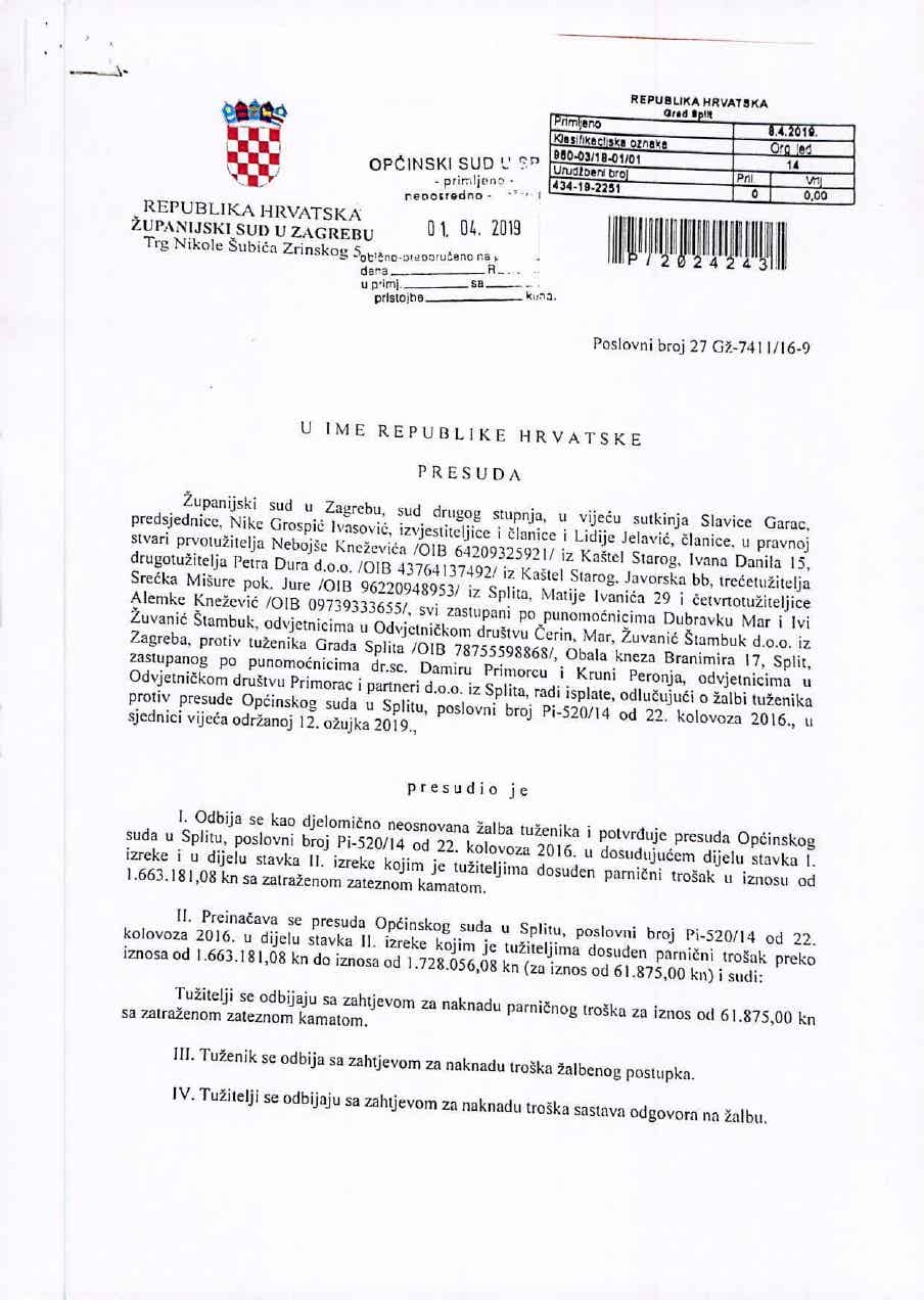 Ovom presudom Grad Split ima 15 dana da ispuni svoju obavezu. Izglednije je međutim da će žalbom - na koju imaju pravo, a koja odgađa izvršenje - kupiti nešto vremena...