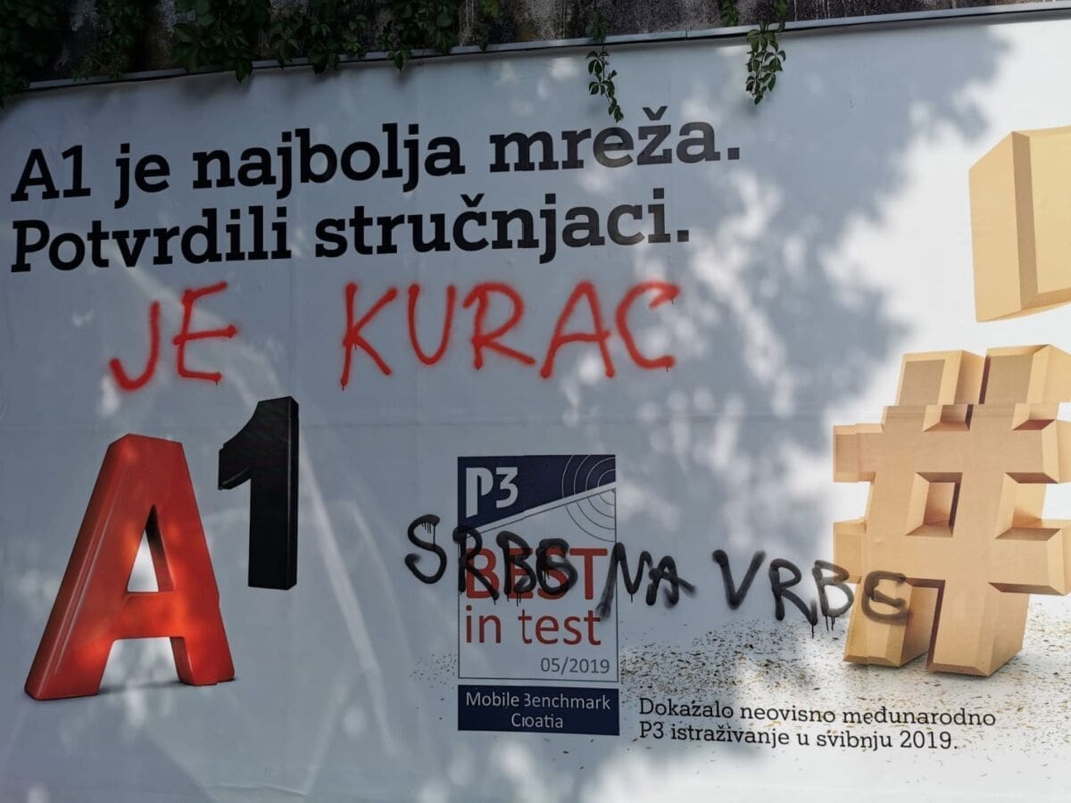 Na susjednom plakatu koja reklamira tvrtku A1 istu je poistovjećeno s muškim spolovilom, no na istom plakatu napisan je i grafit koji poziva na mržnju i nacionalnu netrpeljivost "Srbe na vrbe".